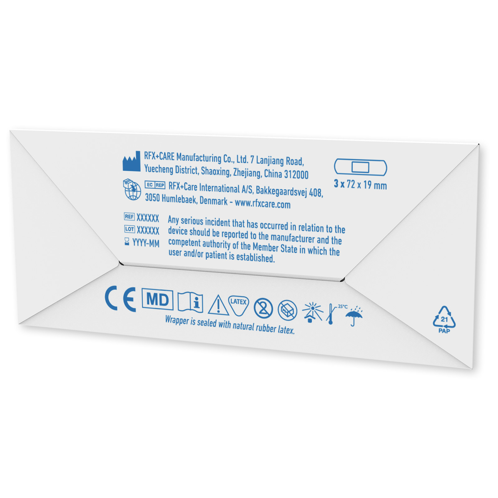 Tres tiritas personalizables presentadas en un sobre de papel kraft (tamaño plegado: 95 x 40 mm). Impresión digital a todo color disponible en el embalaje. Este producto cumple con los estrictos requisitos del Reglamento sobre los productos sanitarios (MDR) y está registrado en la FDA en varios países. Cumple las normas ISO14001:2015 e ISO9001:2015. Tamaño del apósito: 72 x 19 mm.