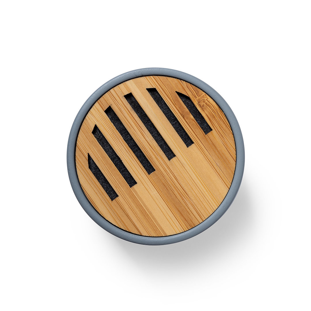 Altavoz Bluetooth en combinación de piezas de bambú de corte nature y cemento de piedra caliza, un conglomerante formado por la mezcla de materiales naturales, principalmente piedra caliza molida y agua, obteniendo un material de gran consistencia y durabilidad. De tamaño compacto, con conexión Bluetooth 5.0 y 3W de potencia. Compatible con iOS y Android, incluye cable de carga micro USB y viene presentado en atractiva caja de diseño. Disponible manual de instrucciones español e inglés. Conexión Bluetooth. Potencia Sonido 3W. Batería 300 mAh