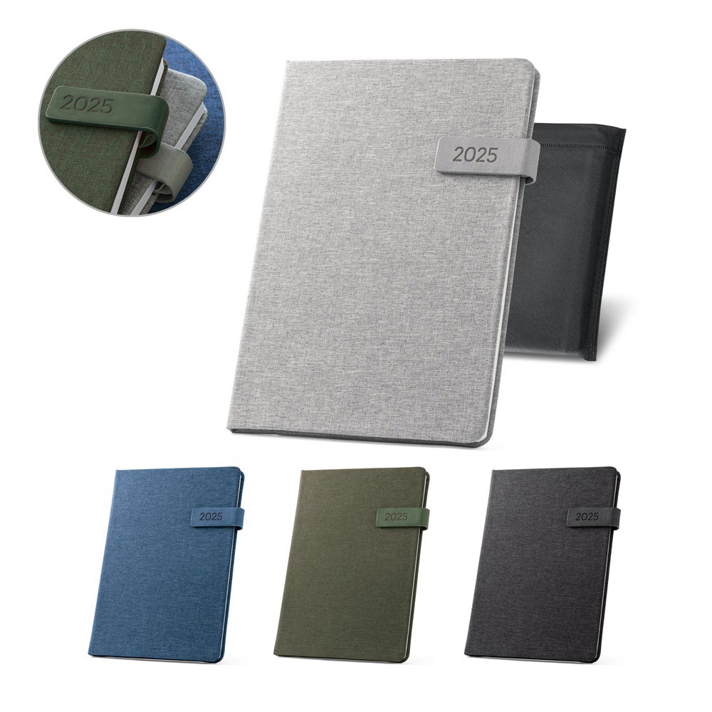 Agenda B5 con tapa de rPET. Incluye soporte para bolígrafo, marcapáginas y cierre de goma del mismo color. Está organizado con un plan semanal. Se suministra con funda de non-woven. Bolígrafo no incluido. 175 x 245 mm | Funda: 220 x 270 mm