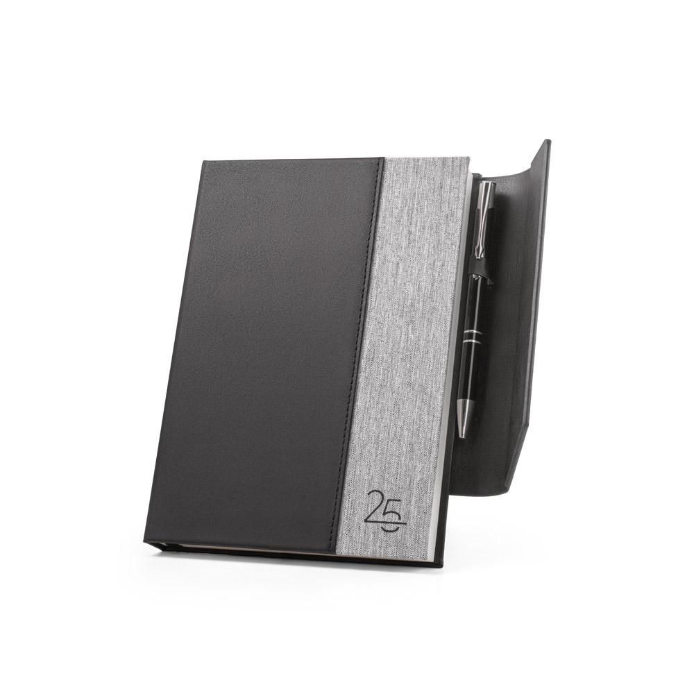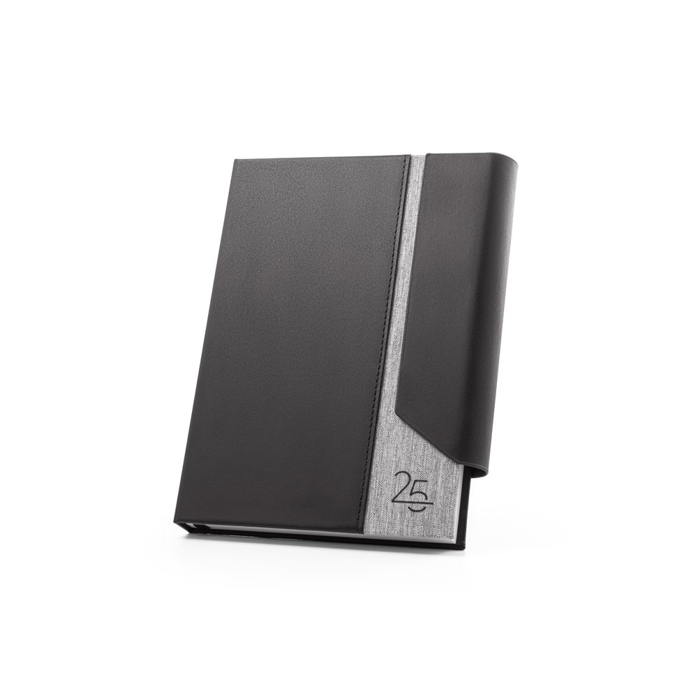 Agenda A5 en PU (58% reciclado) y poliéster reciclado (100% rPET) 300D con cierre magnético. Dispone de soporte para bolígrafo (no incluido) y marcador de cinta. Está organizada en un plan diario, con páginas (70 g/m²) fabricadas con material certificado FSC™ y otros materiales controlados. Una elección elegante y refinada para tu día a día. 148 x 210 mm