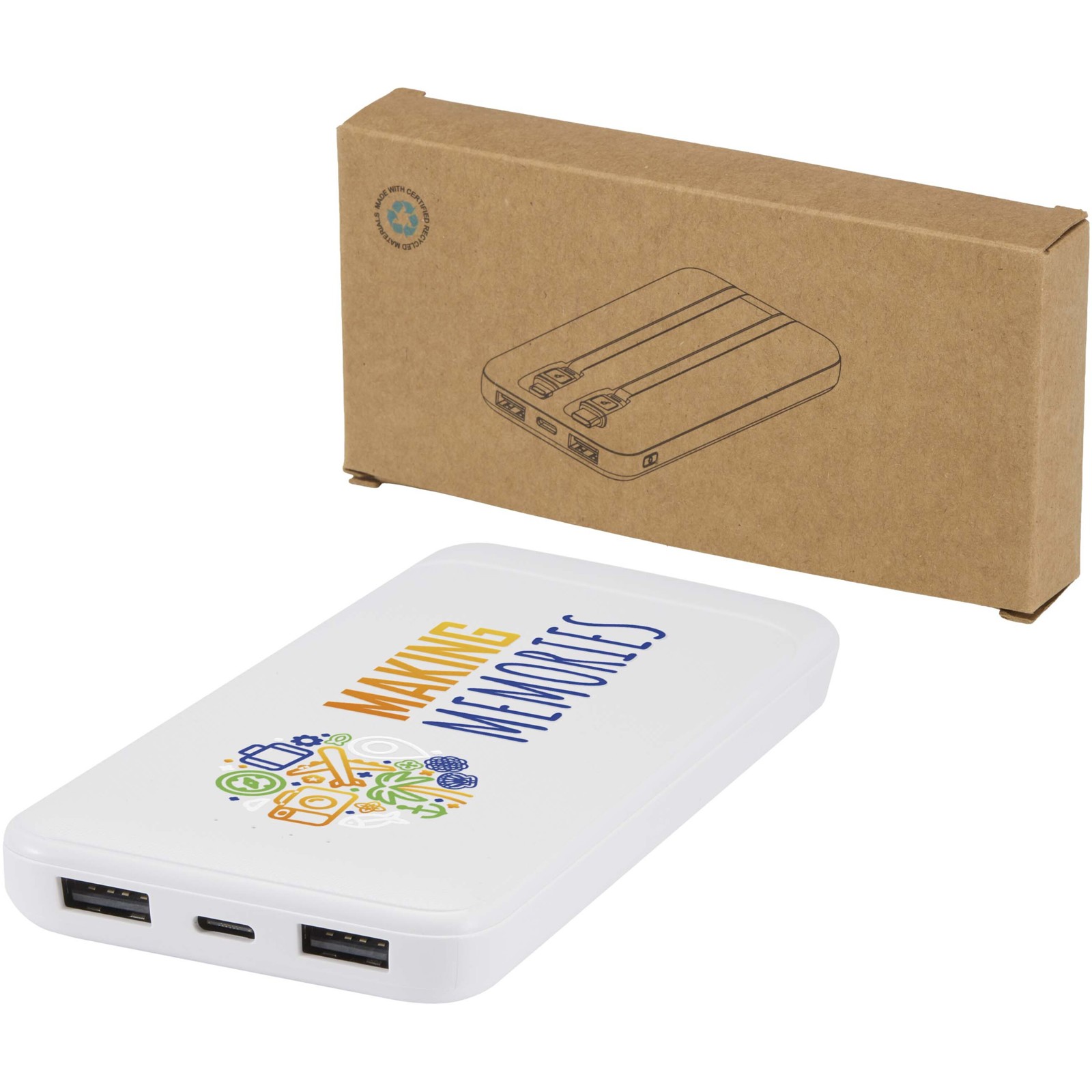 Batería externa de plástico reciclado de 10 000 mAh y 10 W con 2 cables integrados "Adhil" - Blanco