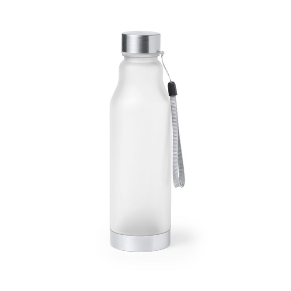 Bidón de 600ml de capacidad. Libre de BPA, con cuerpo de RPET elaborado a partir de plástico reciclado, para así fomentar la reutilización de residuos plásticos y contribuir a la sostenibilidad del planeta. Tapón a rosca en acero inox, con cordón de transporte y base a juego. Disponible en variada gama de colores. 600 ml