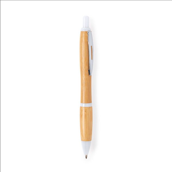 Bolígrafo con mecanismo pulsador de línea nature, con cuerpo en bambú y detalles en variada gama de colores. Con original clip metálico troquelado y cómoda empuñadura de bambú. Tinta azul.