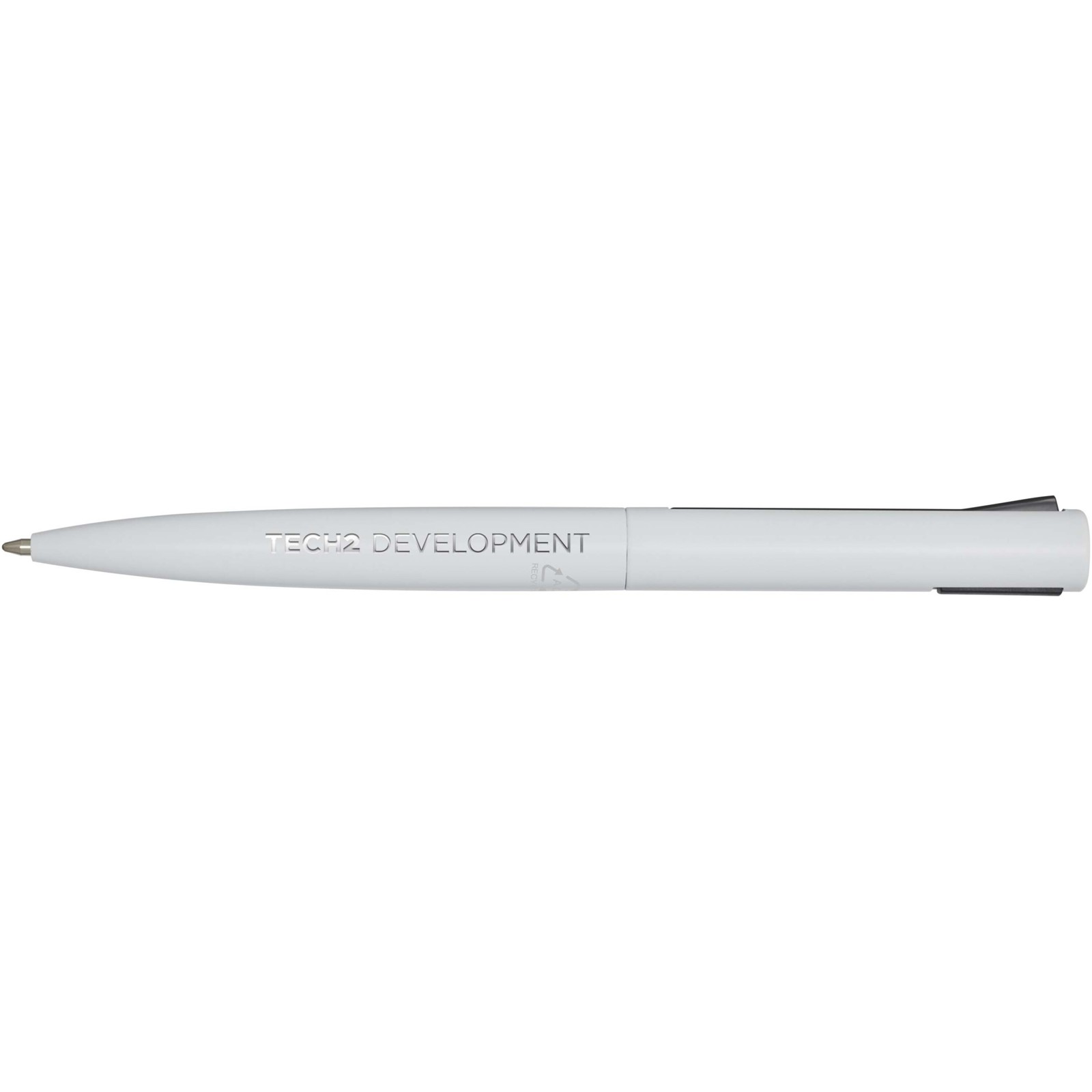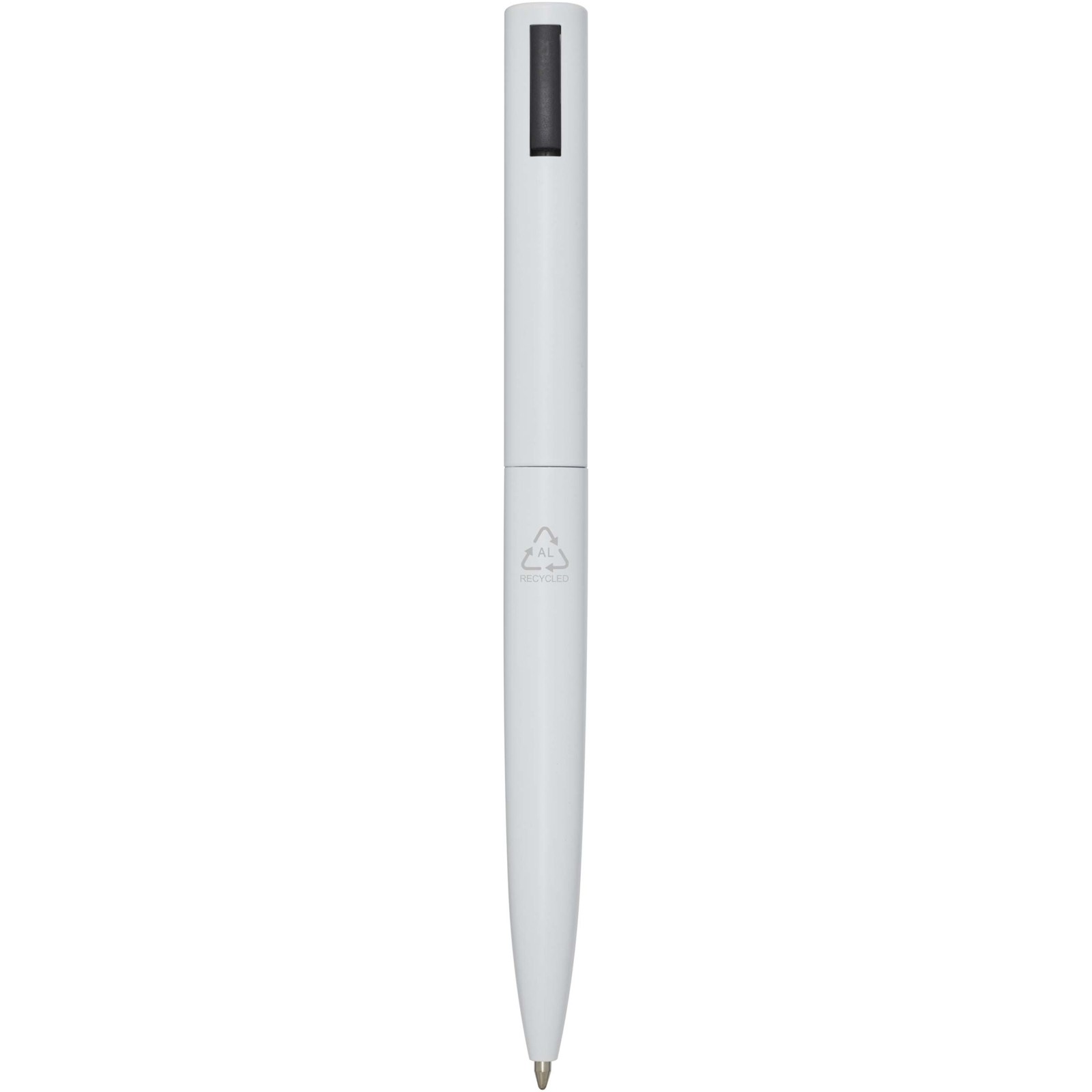 Bolígrafo con la parte superior del cuerpo de plástico reciclado y la parte inferior de aluminio reciclado. El bolígrafo cuenta con un clip de hierro basculante con resorte, lo que permite sujetarlo a objetos más gruesos, como bolsos o cuadernos. El clip se gira con un clic audible. Color de la tinta: Azul. Longitud de escritura: 1000 metros. Tamaño del plumín: 1,0 mm.