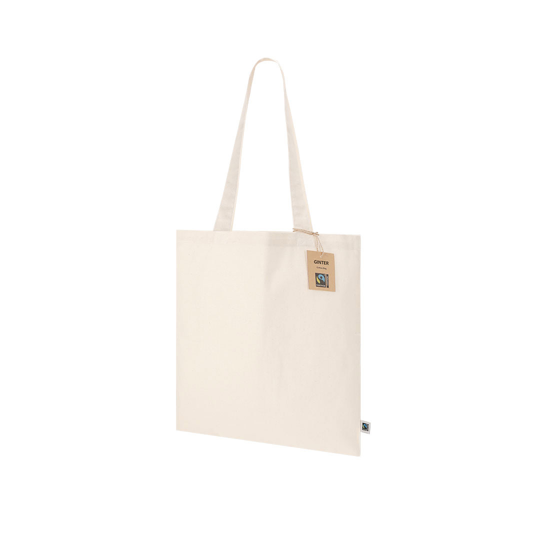 Bolsa confeccionada principalmente en algodón de 140g/m2. Con certificación Fairtrade (Comercio Justo) un sistema comercial solidario y alternativo al convencional que persigue el desarrollo de los pueblos y la lucha contra la pobreza. De acabado cosido, con asas largas de 70cm y resistencia hasta 7kg de peso. Incluida etiqueta Fairtrade y hangtag distintivo en cartón reciclado.