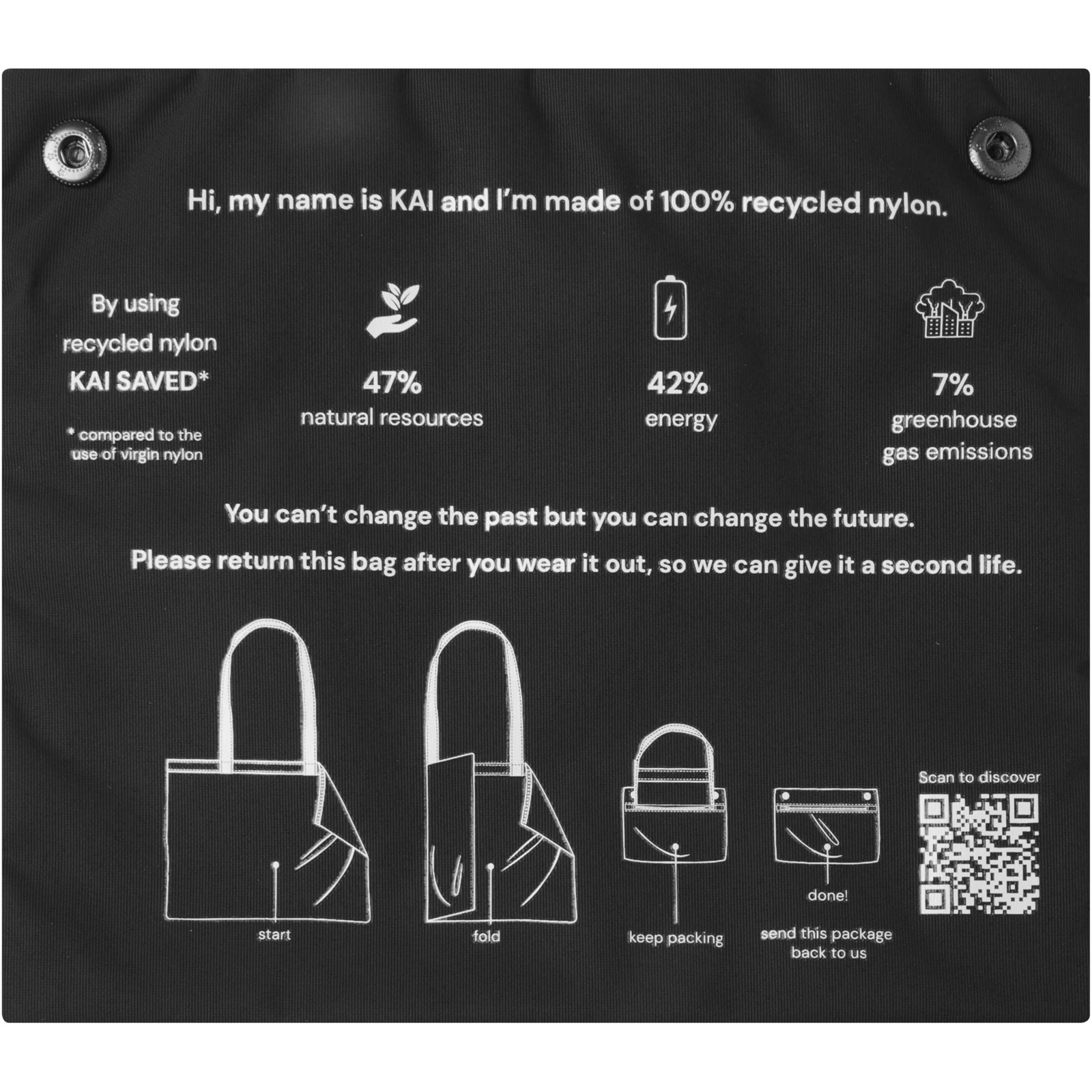 La bolsa Tote "Kai" circular reciclada GRS es la mejor opción en términos medioambientales. Una opción más sostenible empieza por un mejor diseño que tenga menos impacto en el medio ambiente. Solo con 1 bolsa, la reducción media total del impacto es la siguiente: 7 % de huella de carbono, 42 % de energía y 47 % de costes ecológicos. Fabricada con nylon reciclado certificado GRS 200T, la bolsa Tote "Kai" es un modelo clásico y atemporal adecuado para el uso diario. El lugar designado para la impresión es el bolsillo que hace las veces de funda. La bolsa puede devolverse a través de un programa de recogida que incluye un código QR con información adicional.