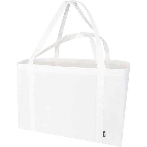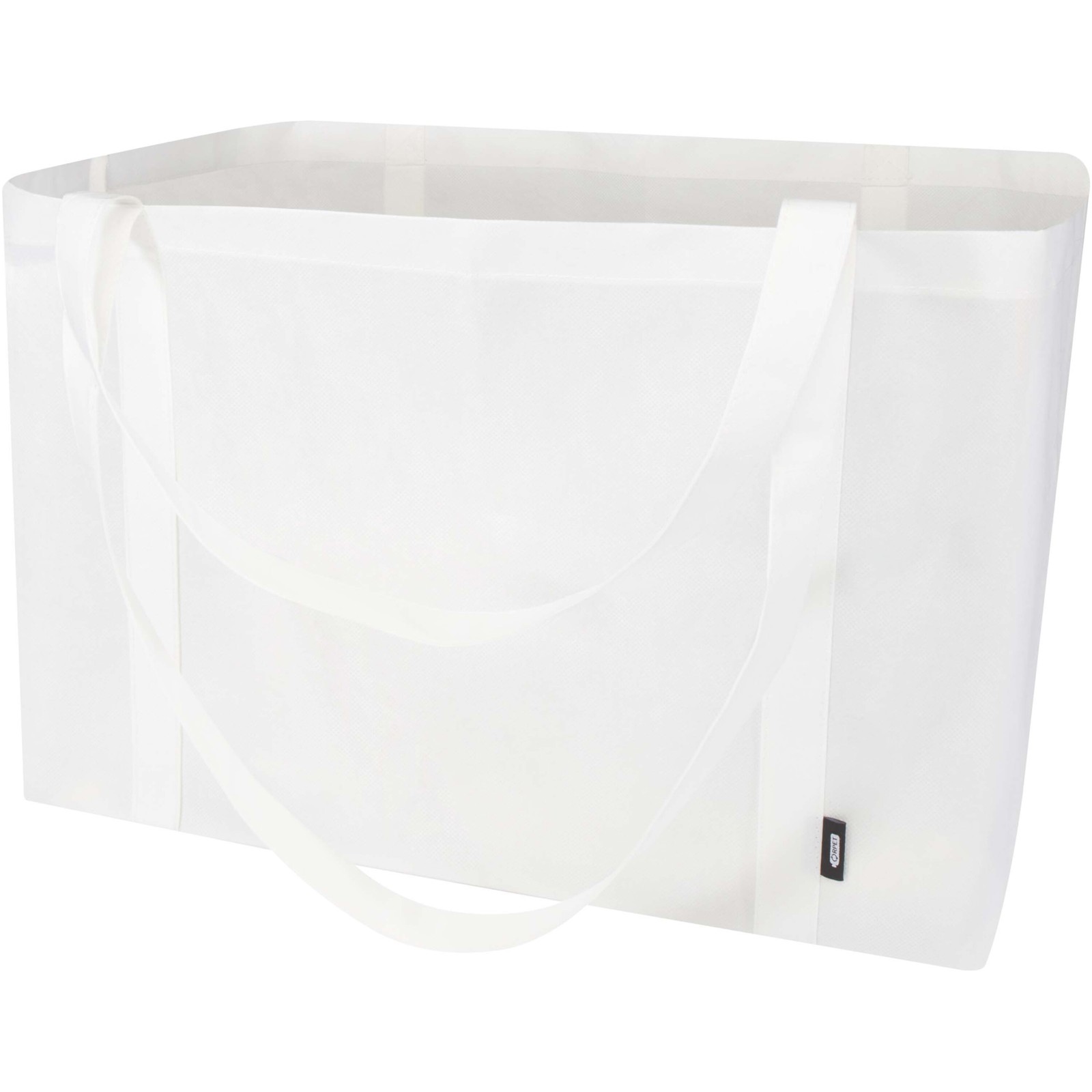 Fabricada con RPET no tejido duradero y resistente al desgarro, la bolsa Tote "Jumbo" con certificado GRS ofrece una capacidad extra de hasta 65 litros para diversas actividades, como hacer la compra o pasar un día en la playa o en el parque. Dispone de asas cortas reforzadas (24 cm) y largas (37 cm) para una máxima comodidad de transporte. Fácil de plegar y guardar cuando no se utiliza. Resistencia para hasta 15 kg de peso.