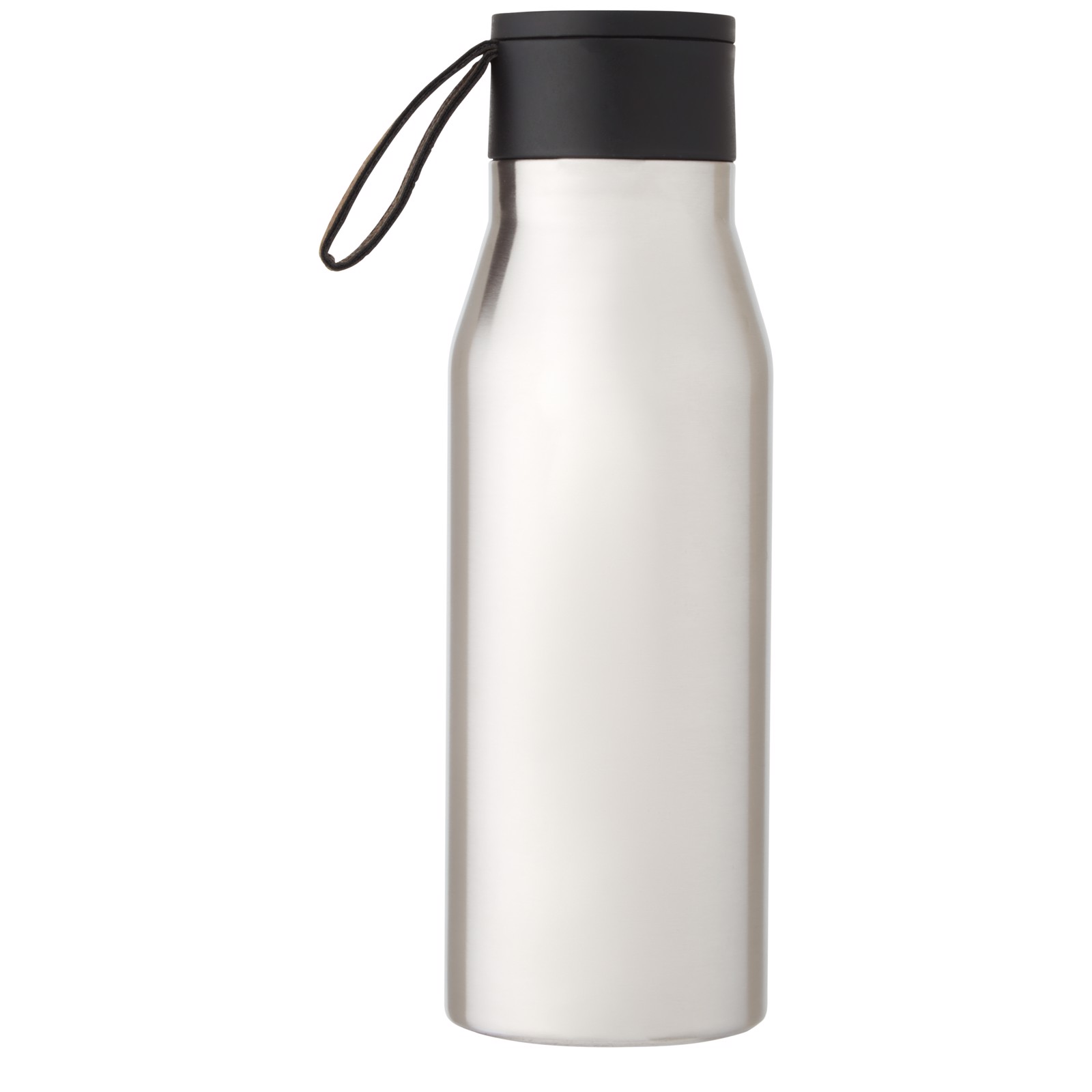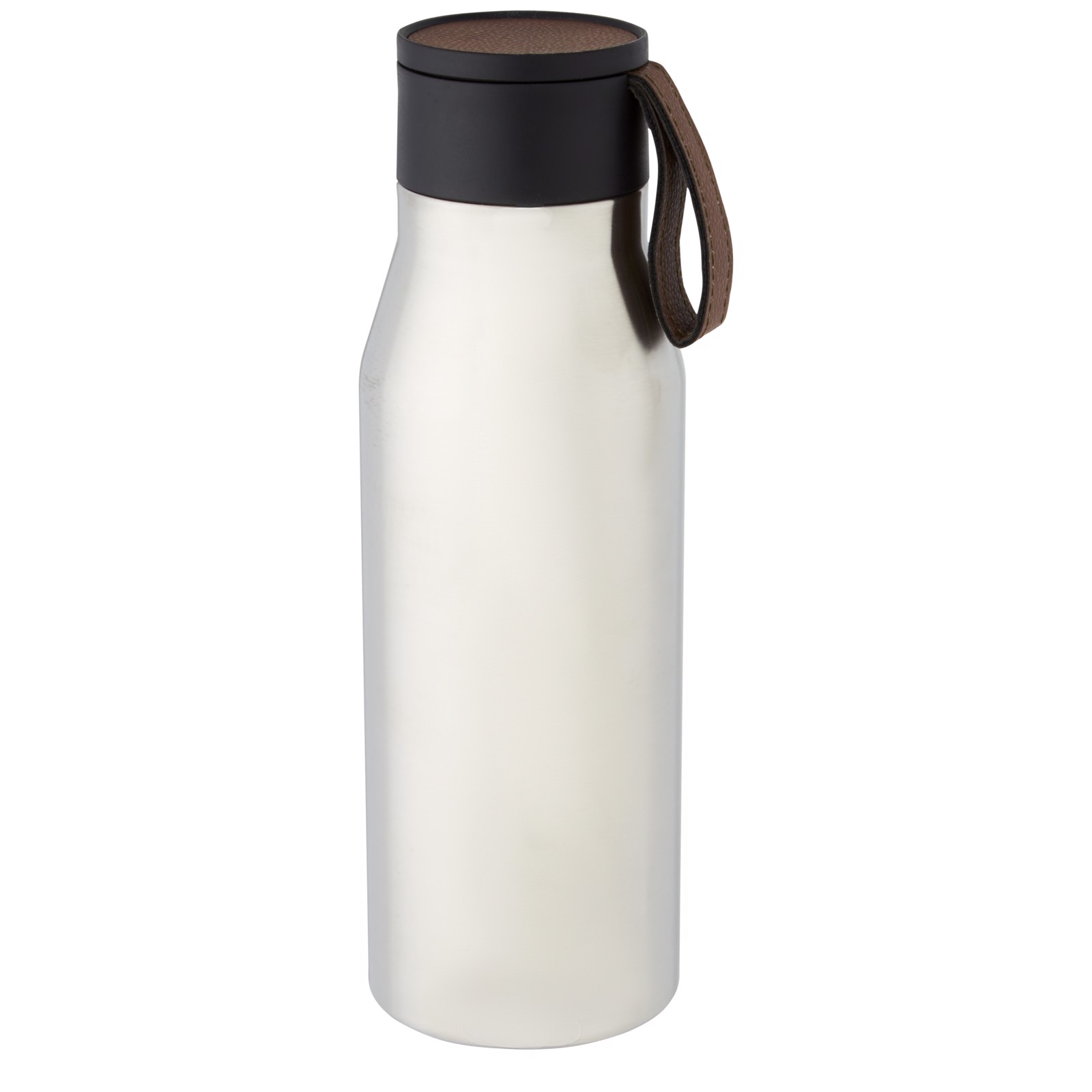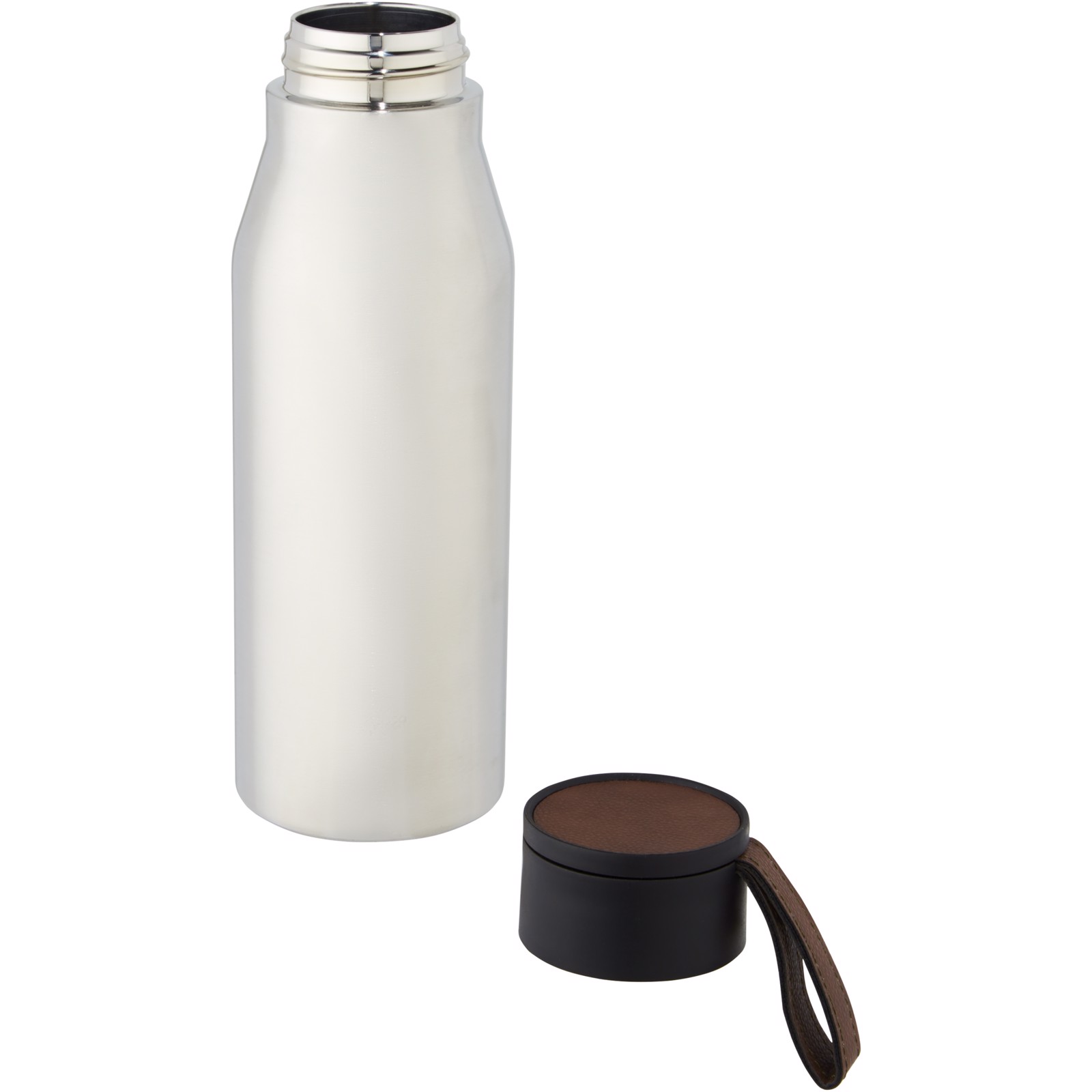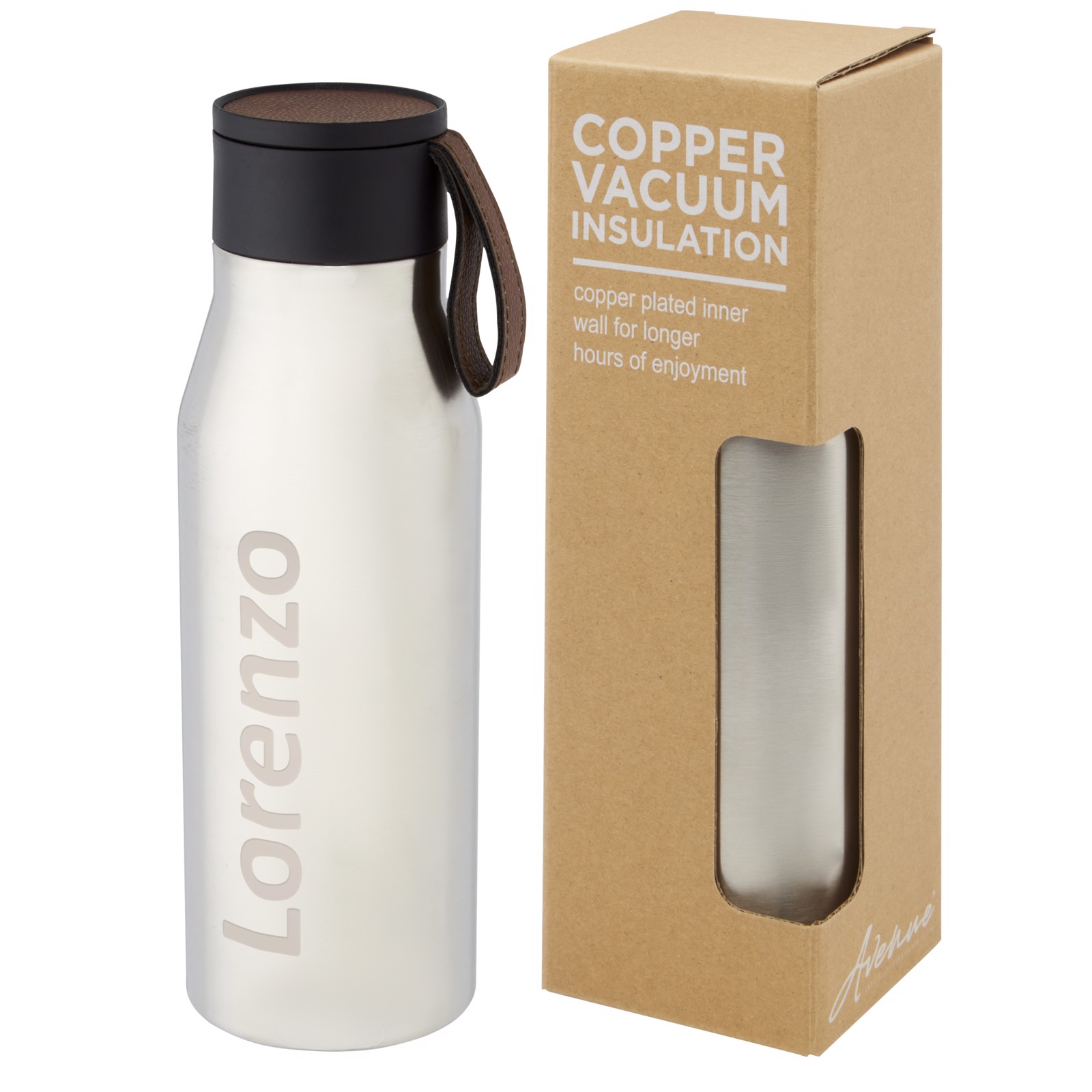 Botella de acero inoxidable con aislamiento al vacío de cobre con un diseño clásico y elegante. Cuenta con una correa de cuero de poliuretano y un detalle en la tapa. Esto lo hace ideal para el grabado láser, que resalta el logotipo en un color plateado y crea un bonito efecto visual. Gracias al acero inoxidable 18/8 con aislamiento al vacío de cobre de doble pared, las bebidas se mantienen calientes o frías durante varias horas. Probado y homologado conforme a la legislación alemana sobre seguridad alimentaria (LFGB), y comprobado el contenido de ftalatos según la normativa REACH. Capacidad de 500 ml. Se presenta en una caja de regalo de cartón reciclado.