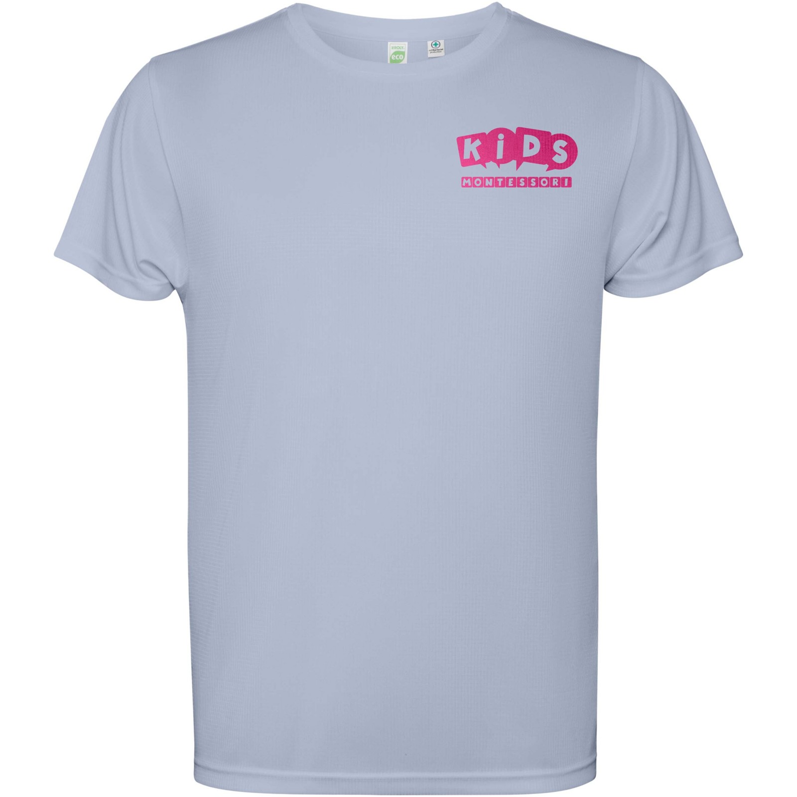 Camiseta técnica de manga corta infantil. Cuello con costuras a juego. Dobladillo trasero ligeramente más largo que el delantero. Costuras laterales desplazadas hacia delante.