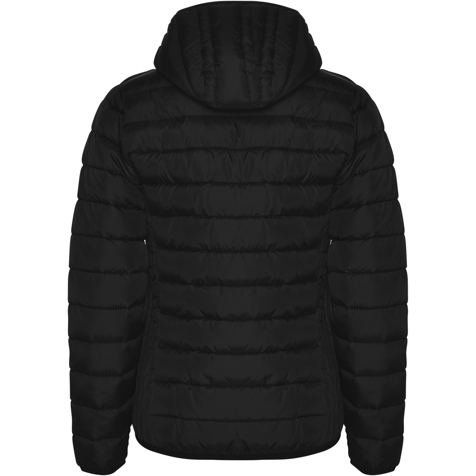 Chaqueta de mujer acolchada con relleno tacto pluma y capucha fija. Cremalleras invertidas con protector de barbilla a juego. Dos bolsillos laterales con cremallera. Ribete elástico a tono en puños, bajos y capucha. Forro interior a contraste. Prenda ligera y plegable. Resistente al agua. Modelo a prueba de viento.