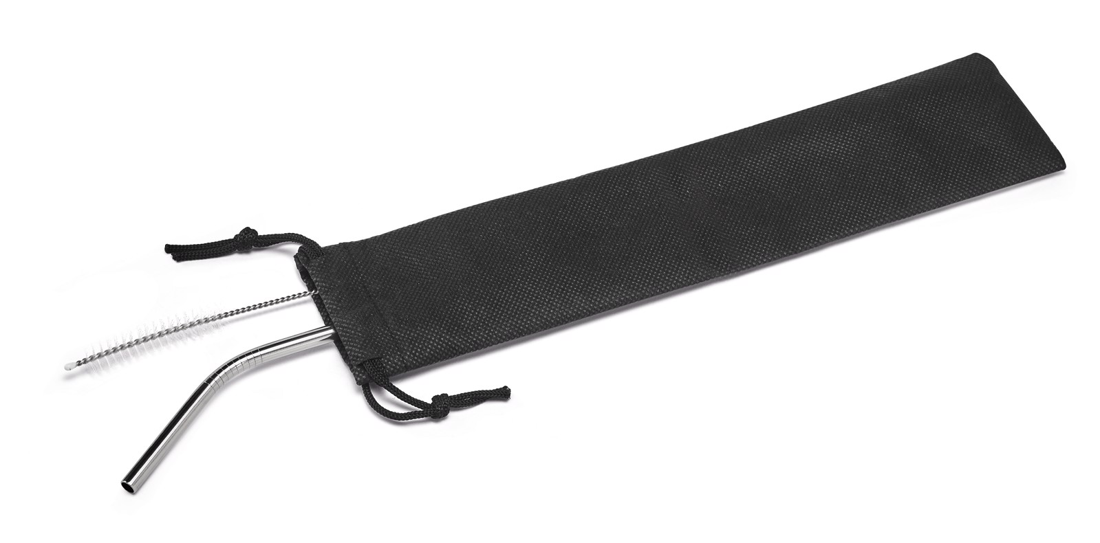 Set de pajita y cepillo de limpieza reutilizables hechos en acero inoxidable. Se presenta en bolsita de tela no tejida (non-woven 80 g/m²). Pajita: ø6 x 215 mm | Funda: 60 x 265 mm
