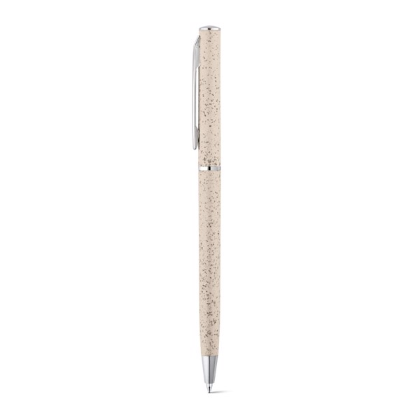 Bolígrafo en fibra de paja de trigo y ABS con mecanismo de giro y clip metálico. Escritura en color negra. ø8 x 126 mm