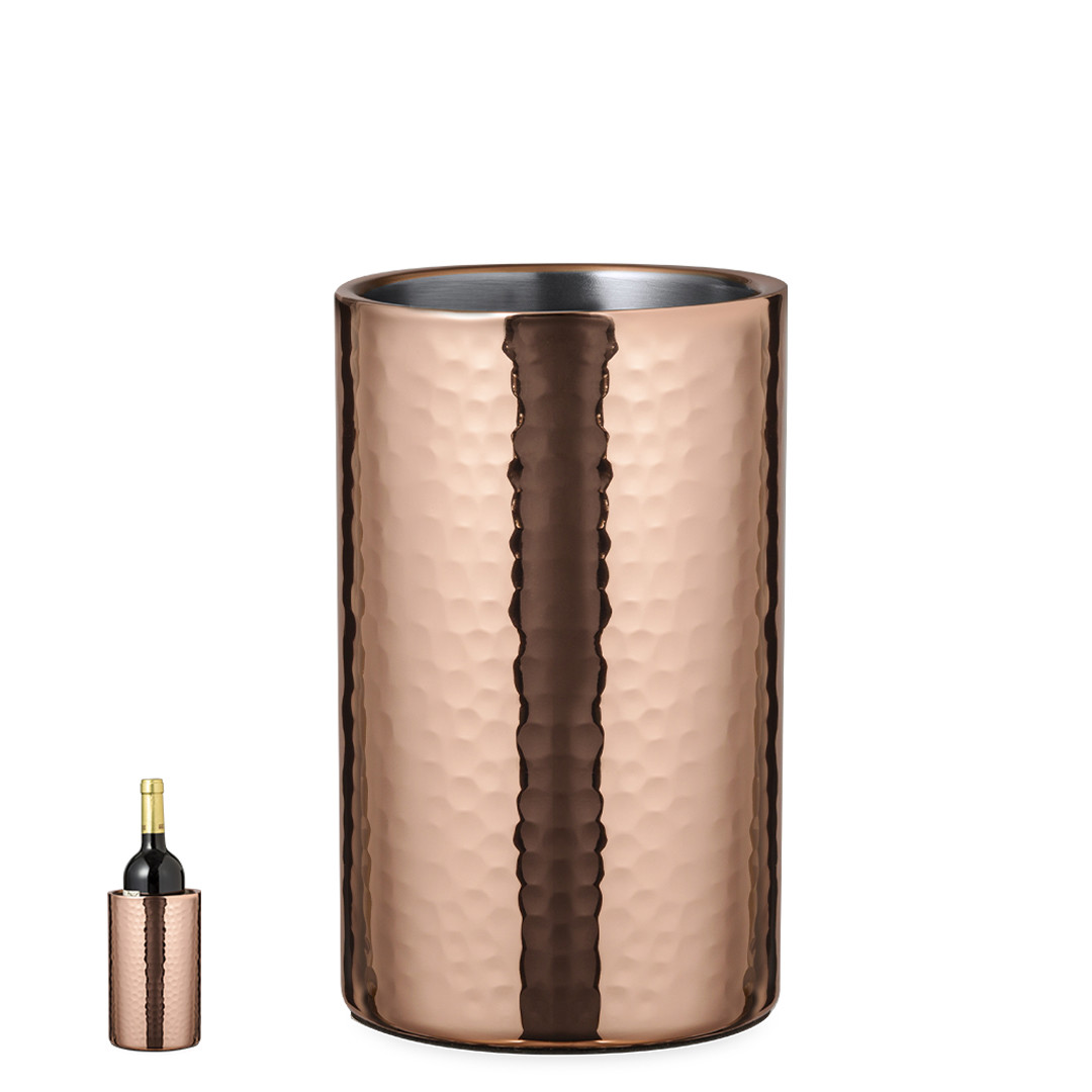 Elegante enfriador de 1 l de capacidad, fabricado en acero inox con recubrimiento de cobre galvanizado. Con original diseño en acabado brillo, es un perfecto accesorio para presentar con estilo las bebidas frías. Presentado en una exclusiva caja individual de diseño negra.