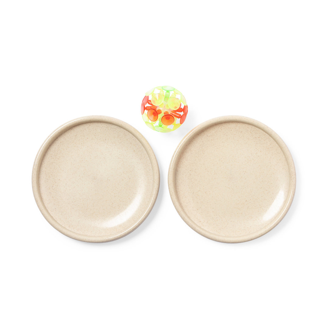 Juego de pelota y palas de disco. Incluye pelota con ventosas y palas de disco lisas, fabricadas en resistente caña de trigo, con cinta elástica para las manos a juego. La caña de trigo fomenta la utilización de materias primas naturales, reduciendo así las emisiones contaminantes.
