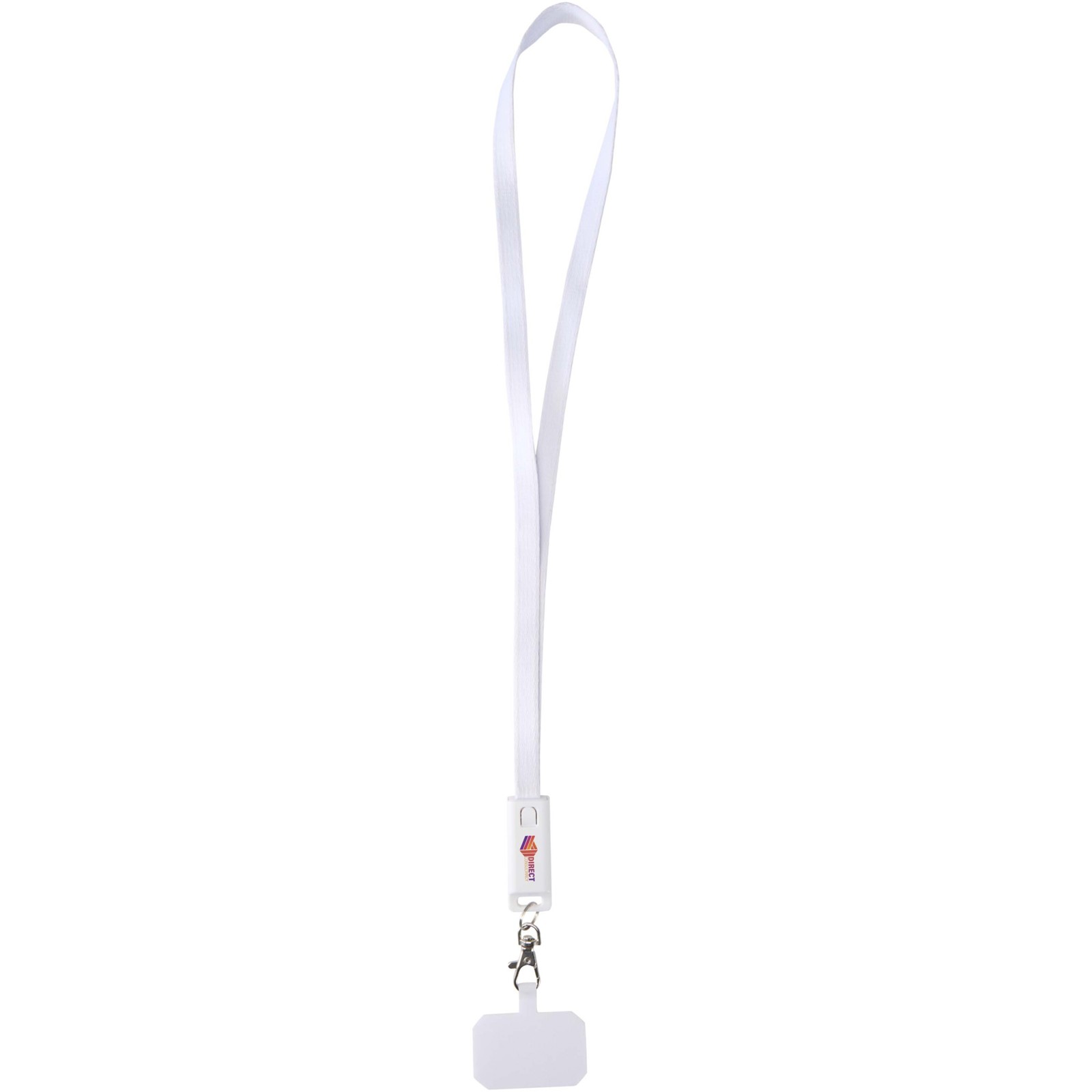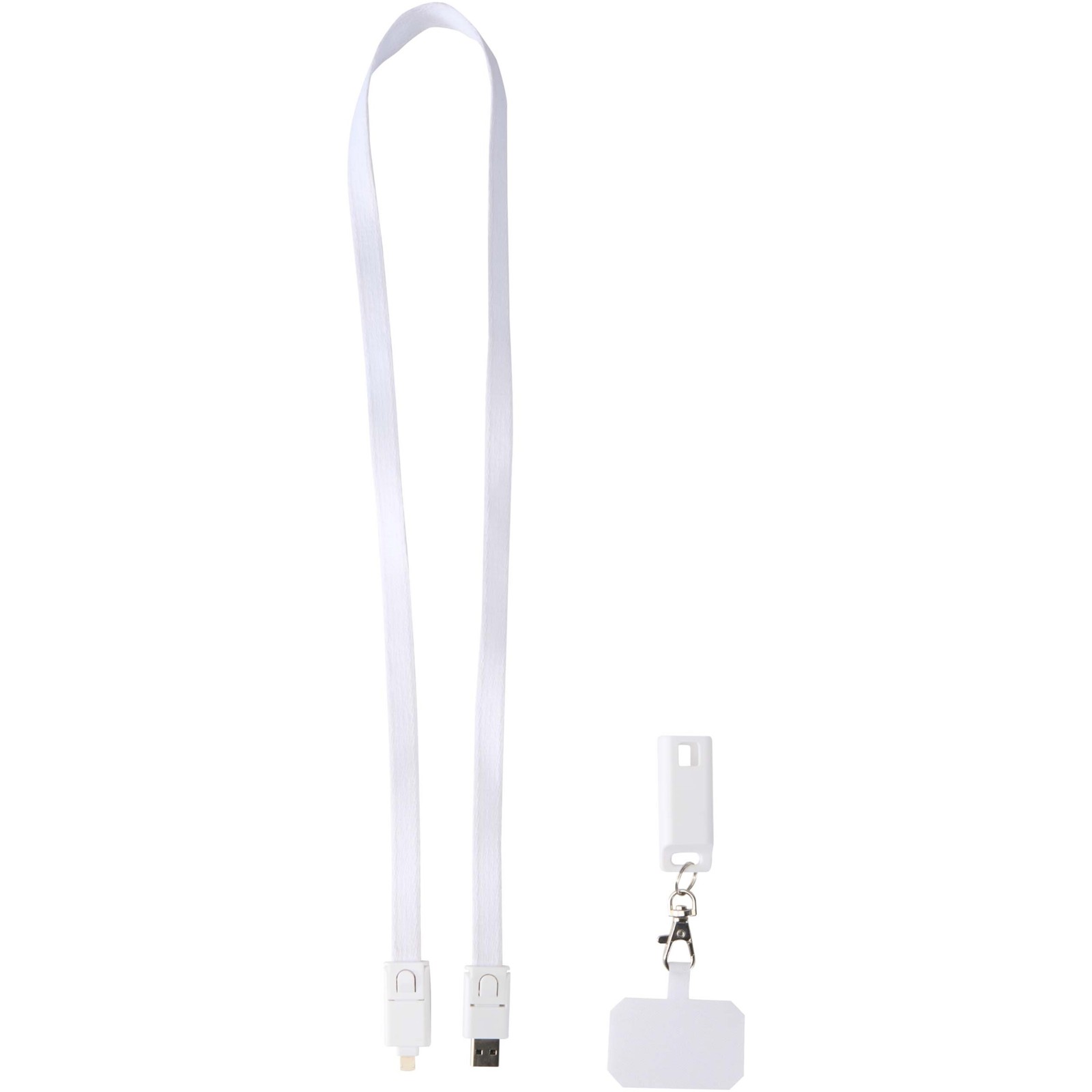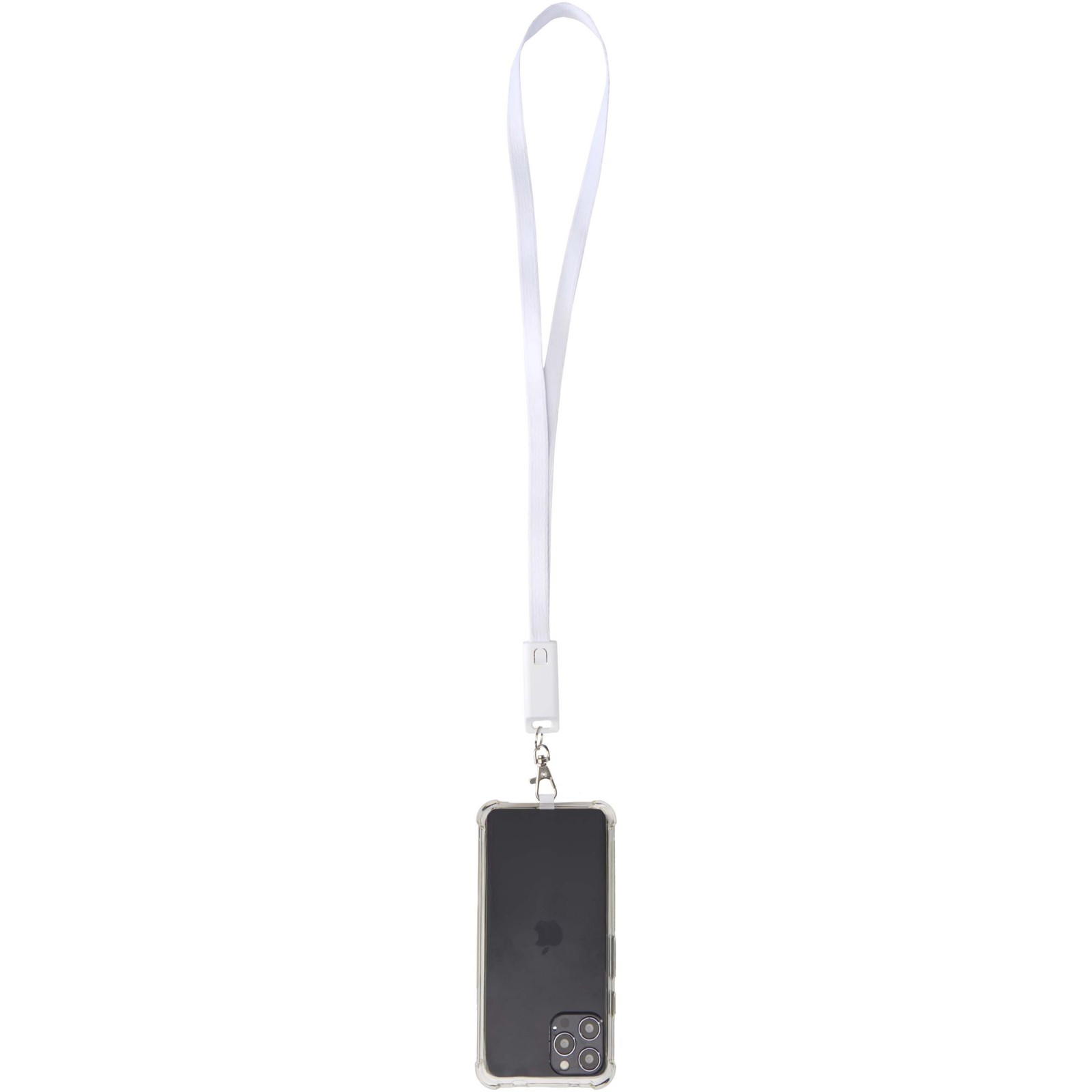 El lanyard para smartphone "Franz" fabricado en plástico reciclado es un práctico accesorio que incorpora un cable de carga 5 en 1 de 65 W, con entradas tipo C y USB-A, y salidas tipo C, Lightning y microUSB. Este cable es lo suficientemente potente como para cargar con rapidez la mayoría de portátiles, tabletas y smartphones. Es compatible con CarPlay y Android Auto, por lo que es perfecto para viajar, trabajar o para usar a diario.