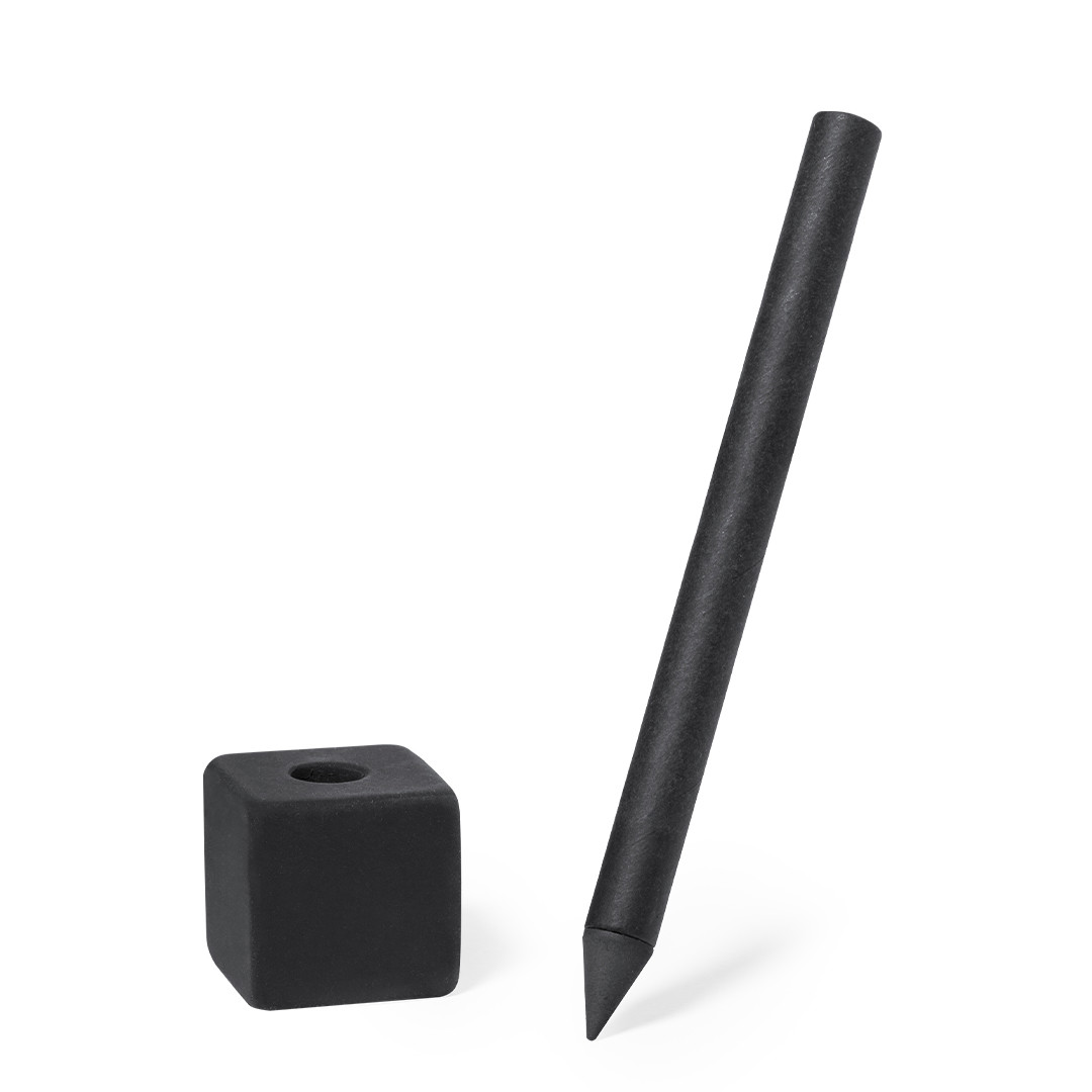 Lápiz eterno fabricado en cartón reciclado con soporte incluido. Práctico instrumento de escritura infinita gracias a su punta que no se desgasta. Con práctica goma de borrar en forma de cubo. Set diseñado en color natural y negro. Presentado individualmente en una caja kraft.