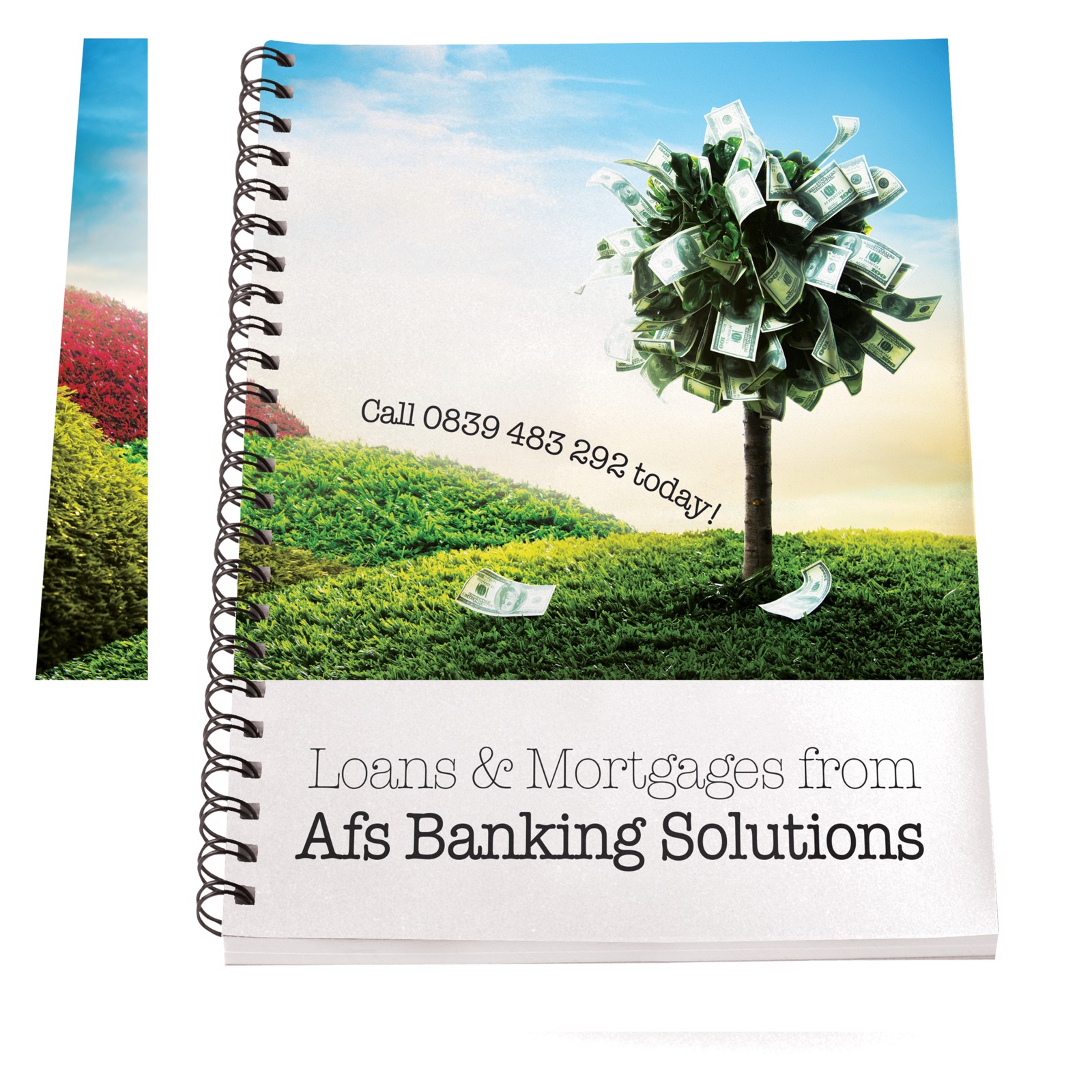 Libreta A4 con espiral "Desk-Mate®". Incluye 50 hojas en blanco de papel de 80 g/m2 y una cubierta frontal resistente a los desgarros y al agua (450 g/m2) . Espiral negra o blanca. Impresión a todo color disponible en la cubierta y en cada hoja.