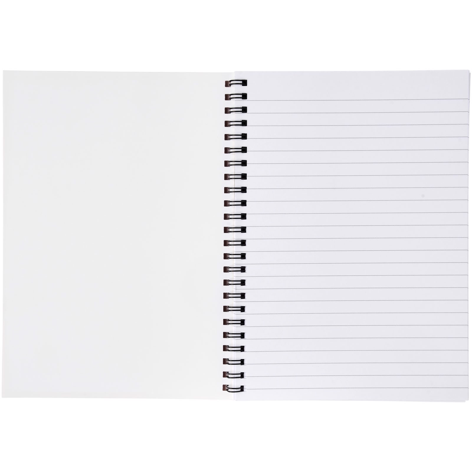 Libreta A5 con espiral "Desk-Mate®". Incluye 50 hojas en blanco de papel de 80 g/m2 y una cubierta frontal resistente a los desgarros y al agua (450 g/m2) . Espiral negra o blanca. Impresión a todo color disponible en la cubierta y en cada hoja.