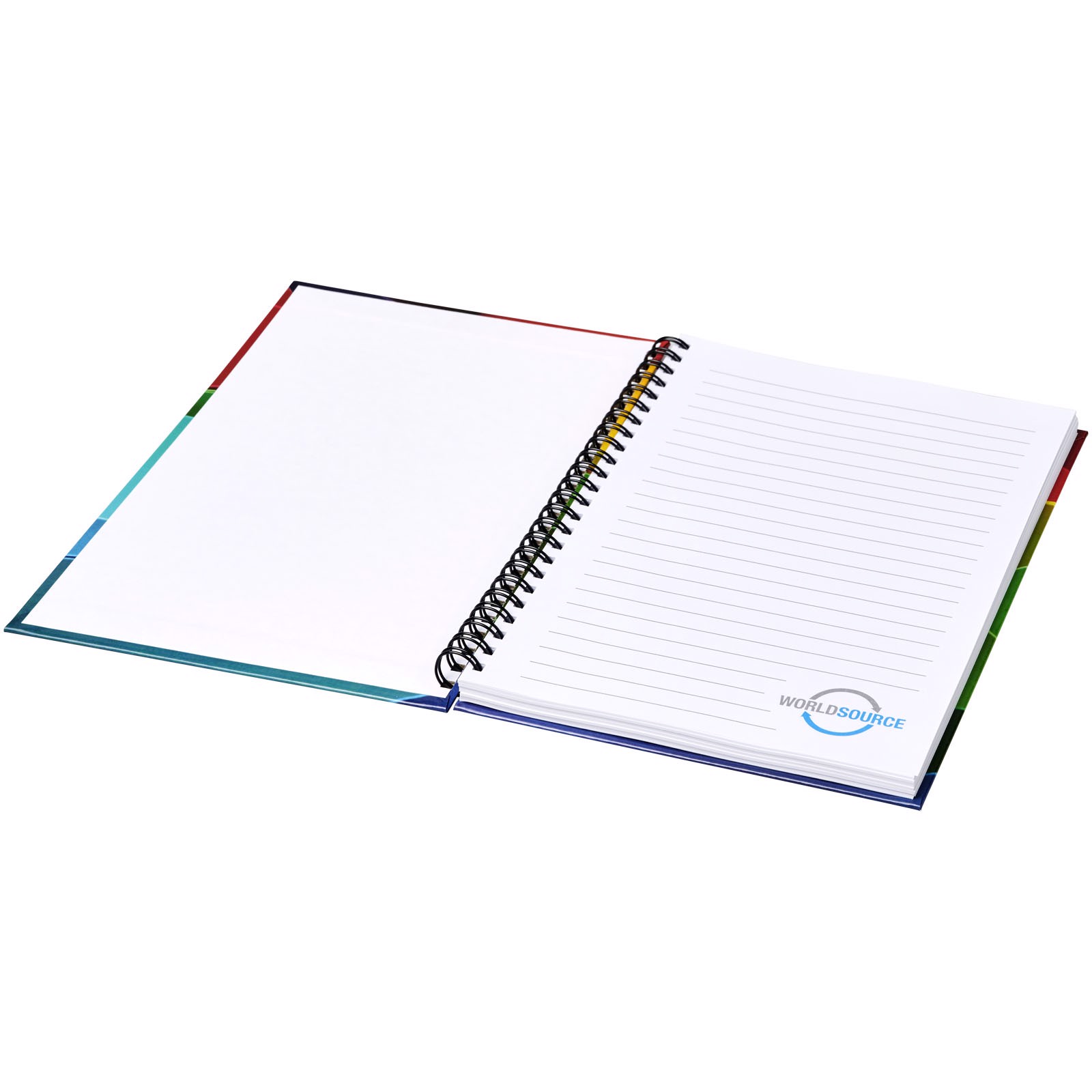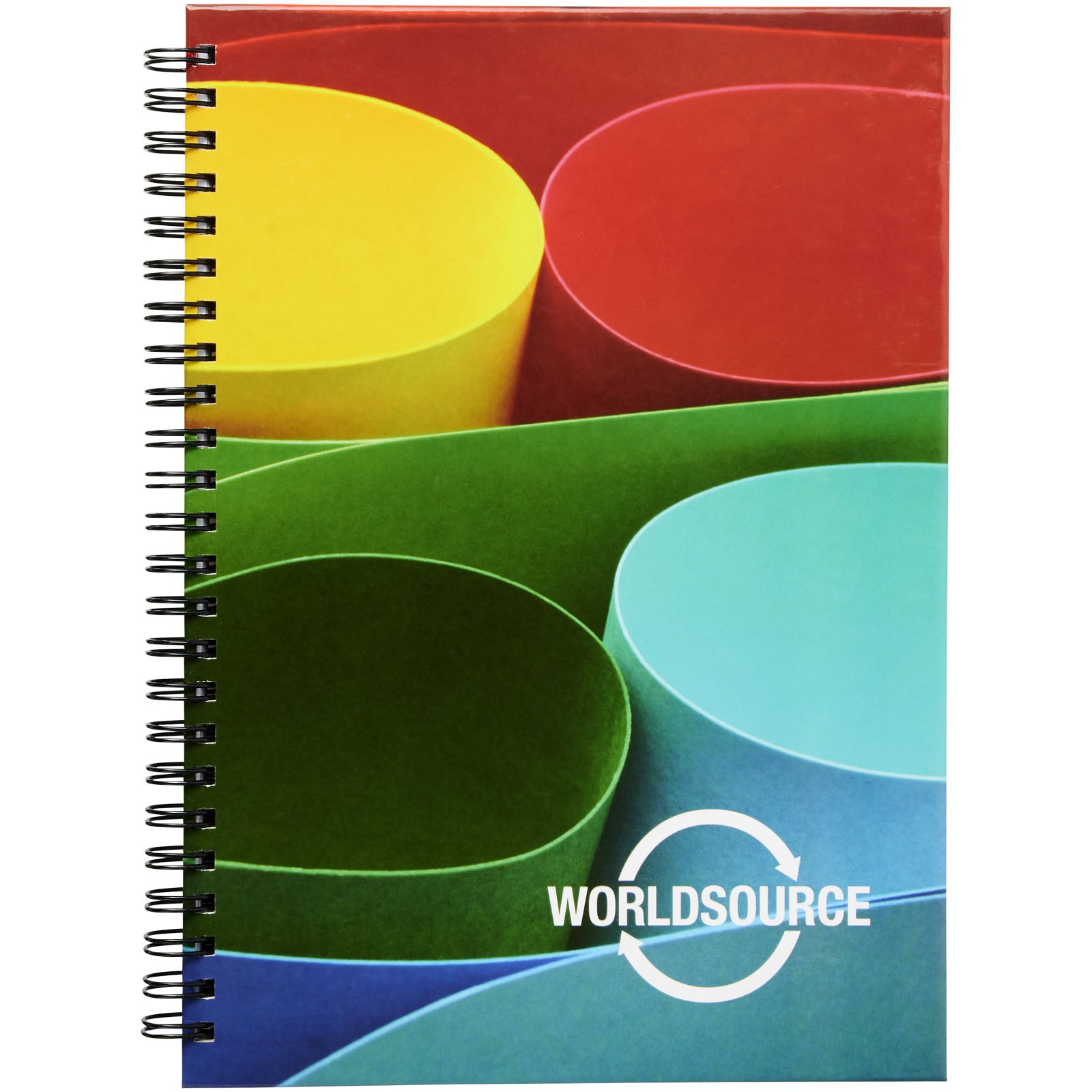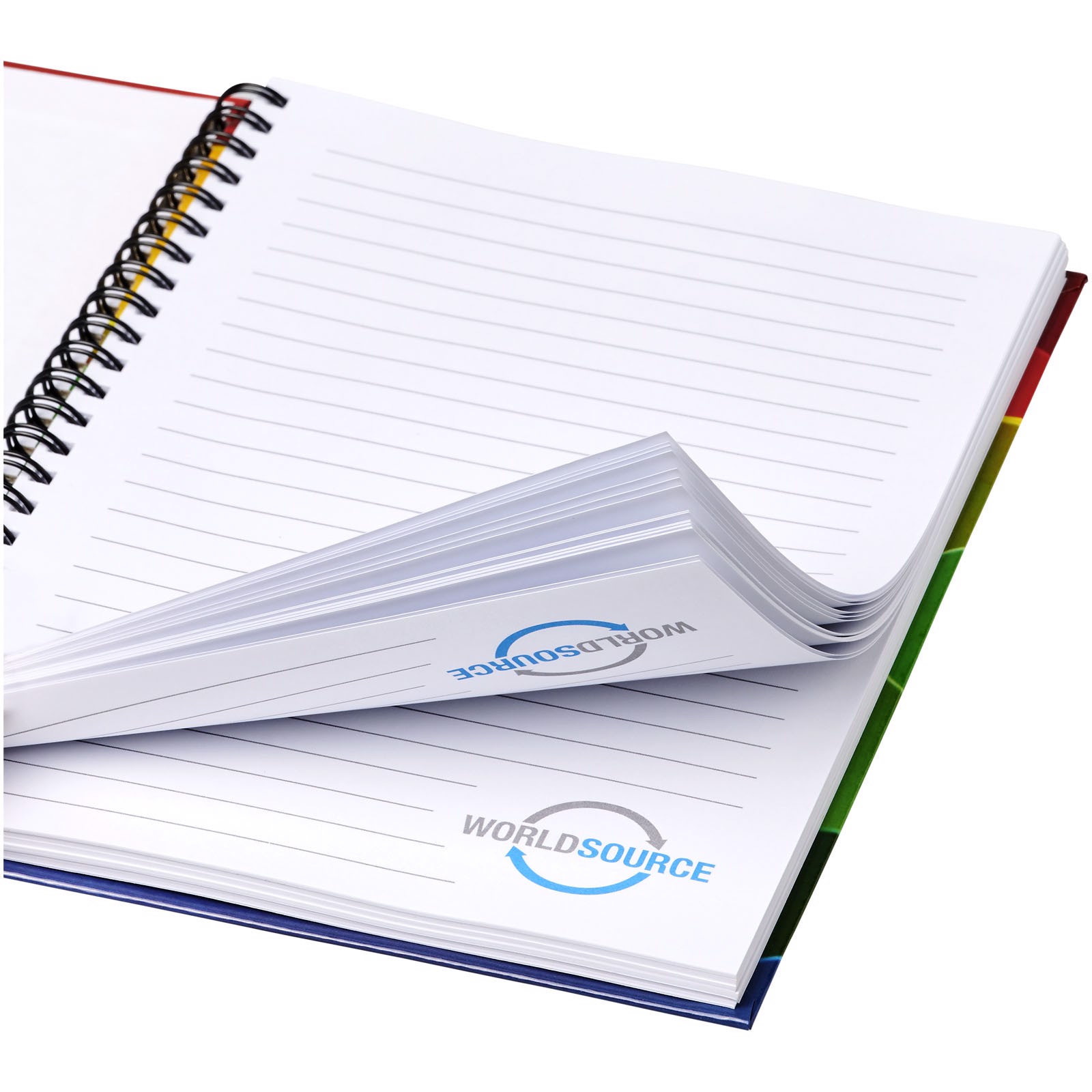 Incluye 80 hojas (80 g/m²) de papel en blanco y un alambre negro o blanco. Disponible en 3 tamaños: A4, A5 y A6. Decoración a todo color disponible en la tapa y en cada hoja, por el anverso y el reverso.