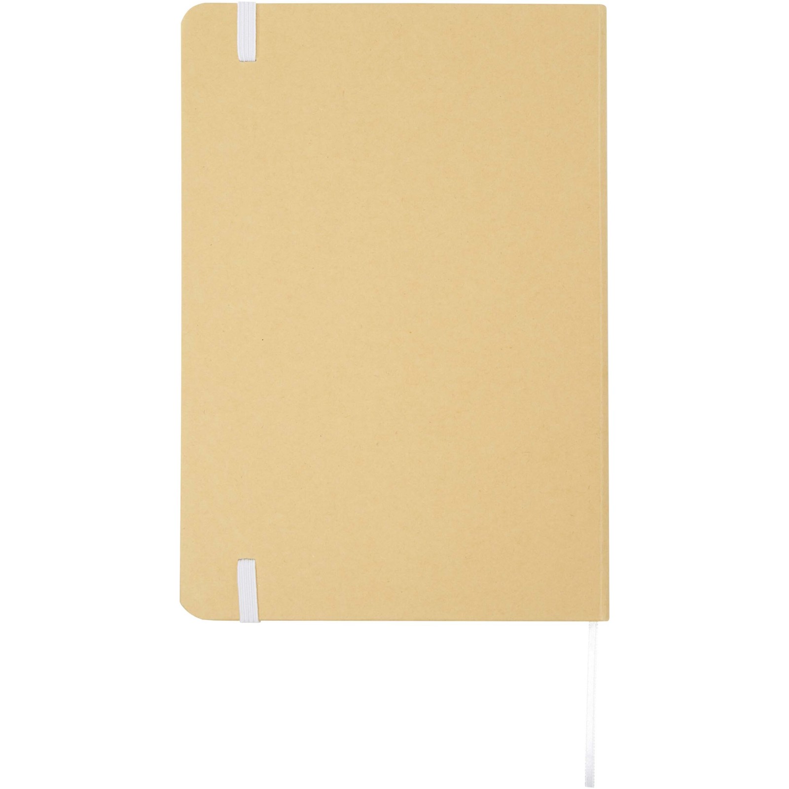 Libreta A5 de tapa dura de cartón reciclado con 80 hojas rayadas de papel de 70 g/m². La libreta tiene un cierre elástico, una cinta y esquinas redondeadas.