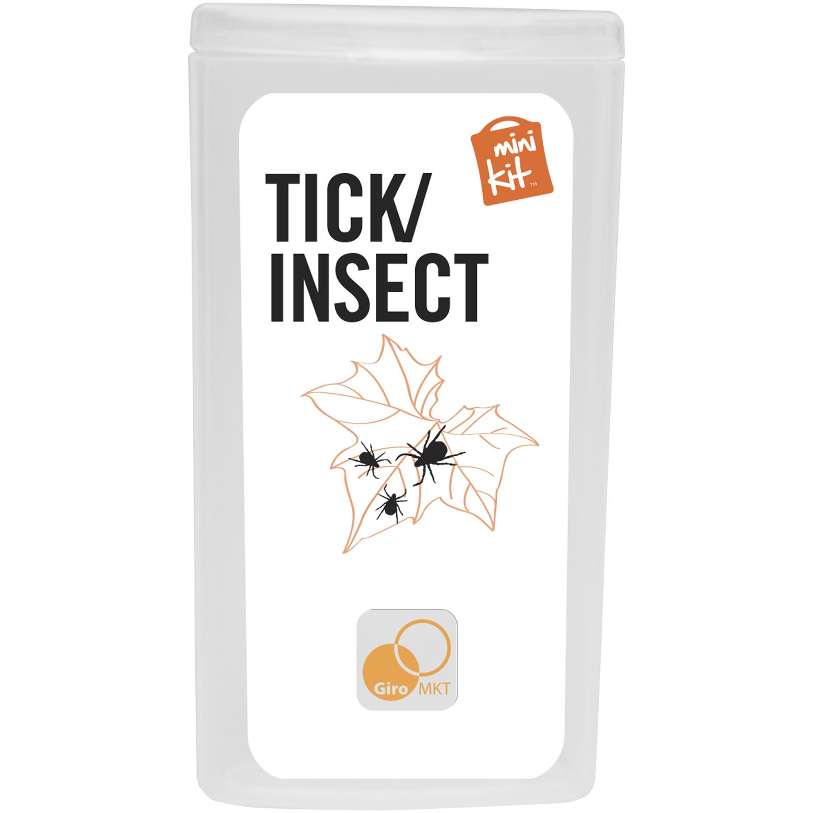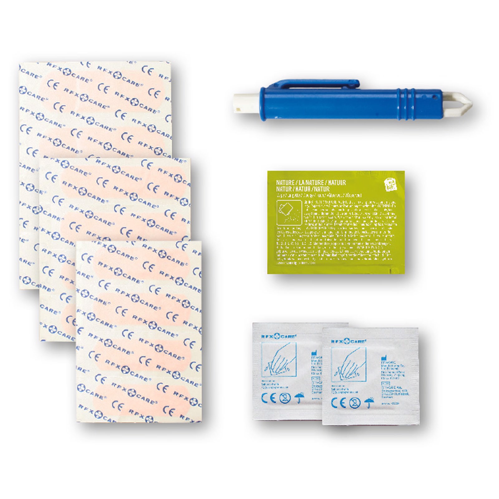 Kit ideal para llevar encima que te prepara para picaduras. Contenido: 1 quita garrapatas azul (humano), 1 toallita repelente de insectos, 2 toallitas limpiadoras, 10 apósitos adhesivos resistentes al agua. Todos los complementos de primeros auxilios cumplen todas las normativas de la UE. El precio incluye impresión a todo color en la etiqueta.