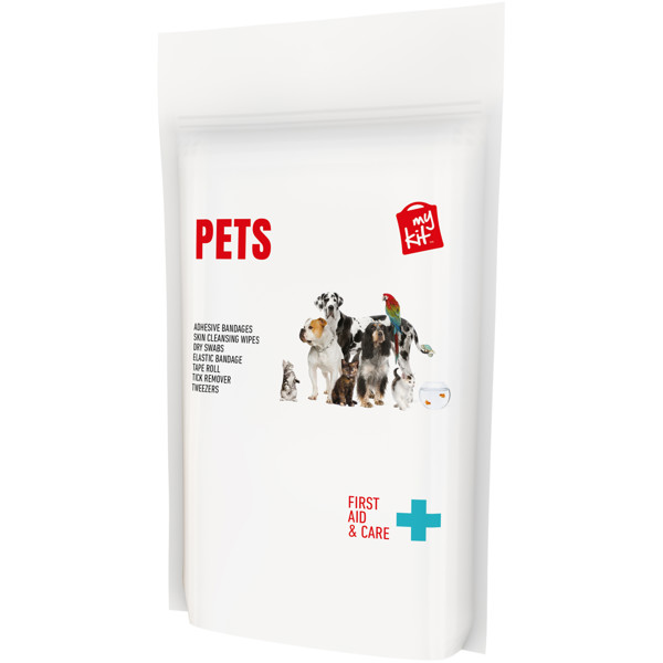 Kit ideal para cualquier amante de las mascotas. Con este kit estarás preparado para pequeñas heridas o picaduras que pueda sufrir mascota. Contenido: 12 apósitos adhesivos resistentes al agua, 4 toallitas limpiadoras, 2 toallitas secas, 1 quita garrapatas, 1 venda elástica, 1 pinza, 1 rollo de cinta adheisva. Todos los complementos de primeros auxilios cumplen todas las normativas de la UE. El precio incluye impresión a todo color en la etiqueta. Se entrega en una bolsa de papel.