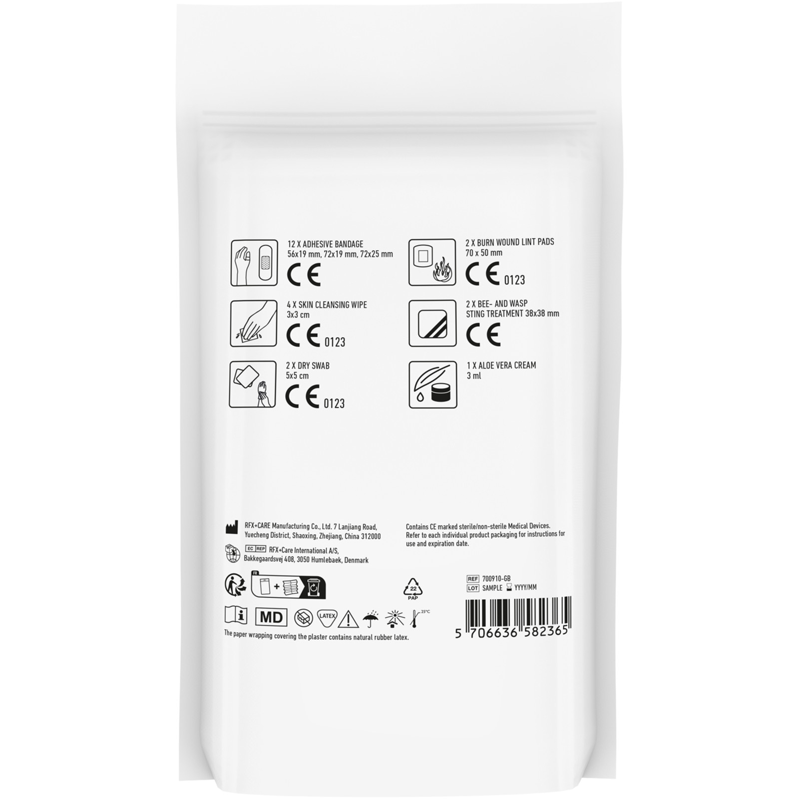 Kit ideal para prevenir las picaduras y mordeduras de insectos. Contenido: 12 apósitos adhesivos resistentes al agua, 4 toallitas limpiadoras, 2 toallitas secas, 2 gasas para quemaduras, 1 parche para picaduras de abeja, 1 crema aloe vera. Todos los complementos de primeros auxilios cumplen todas las normativas de la UE. El precio incluye impresión a todo color en la etiqueta. Se entrega en una bolsa de papel.