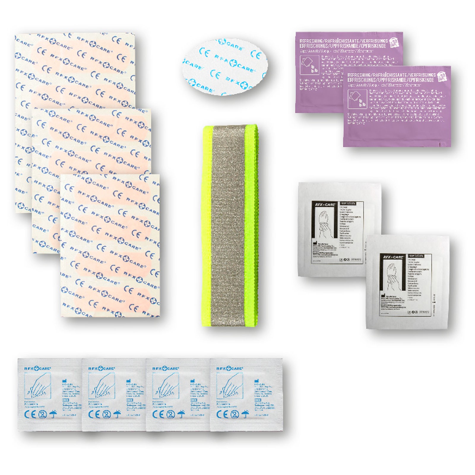Kit ideal para cualquier actividad o evento al aire libre. Con este kit podrás relajarte y refrescarte después de cualquier actividad. Con la banda reflectante serás más visible para los demás. Con los complementos de primeros auxilios estarás preparado para pequeños accidentes o heridas. Contenido: 12 apósitos adhesivos resistentes al agua, 4 toallitas limpiadoras, 2 toallitas secas, 1 banda reflectante, 1 adhesivo para ampollas, 2 toallitas refrescantes. Todos los complementos de primeros auxilios cumplen todas las normativas de la UE. El precio incluye impresión a todo color en la etiqueta.