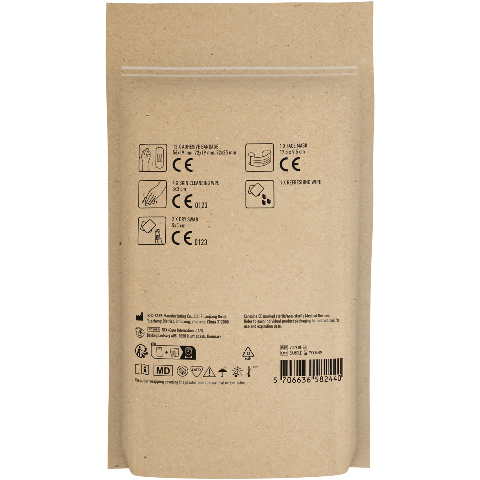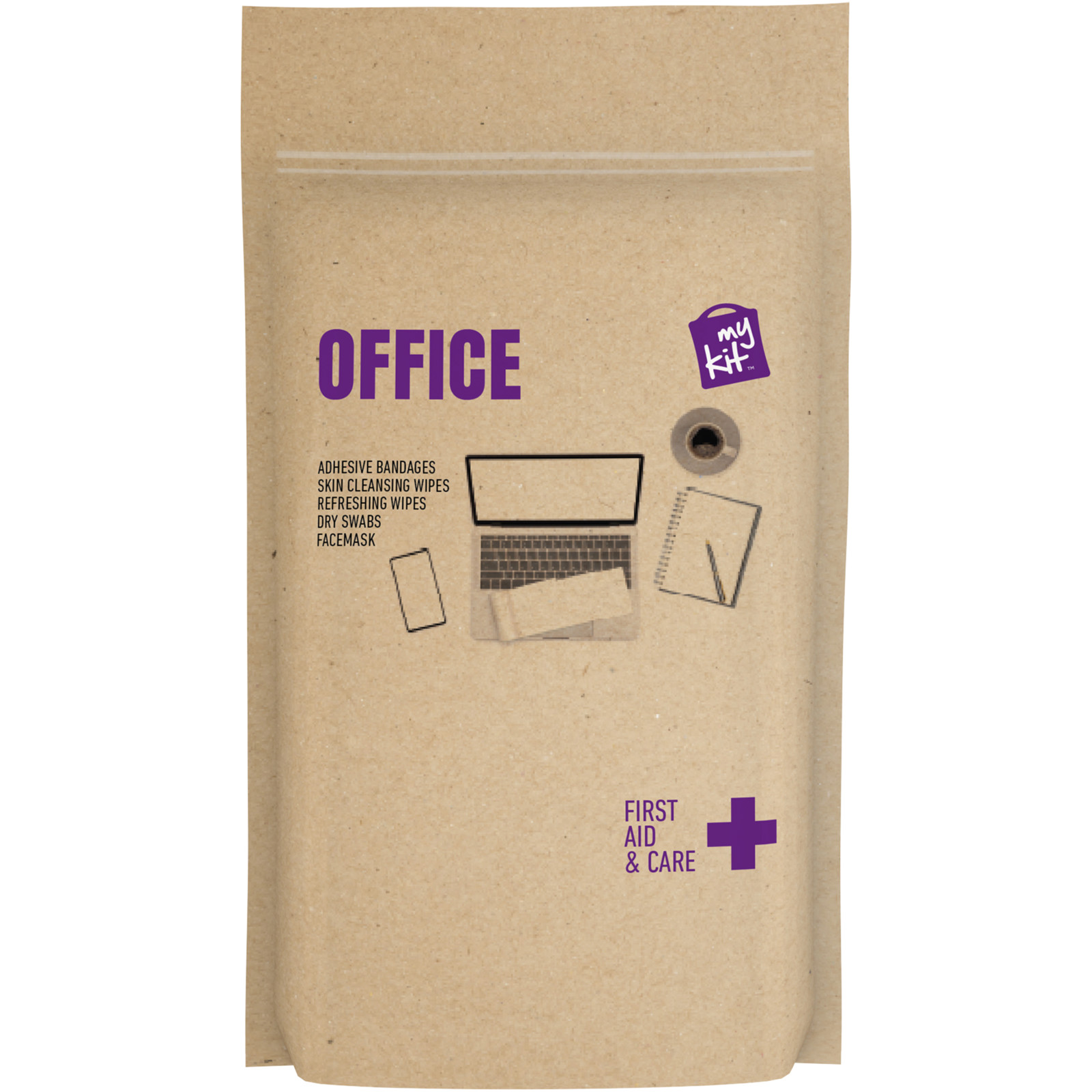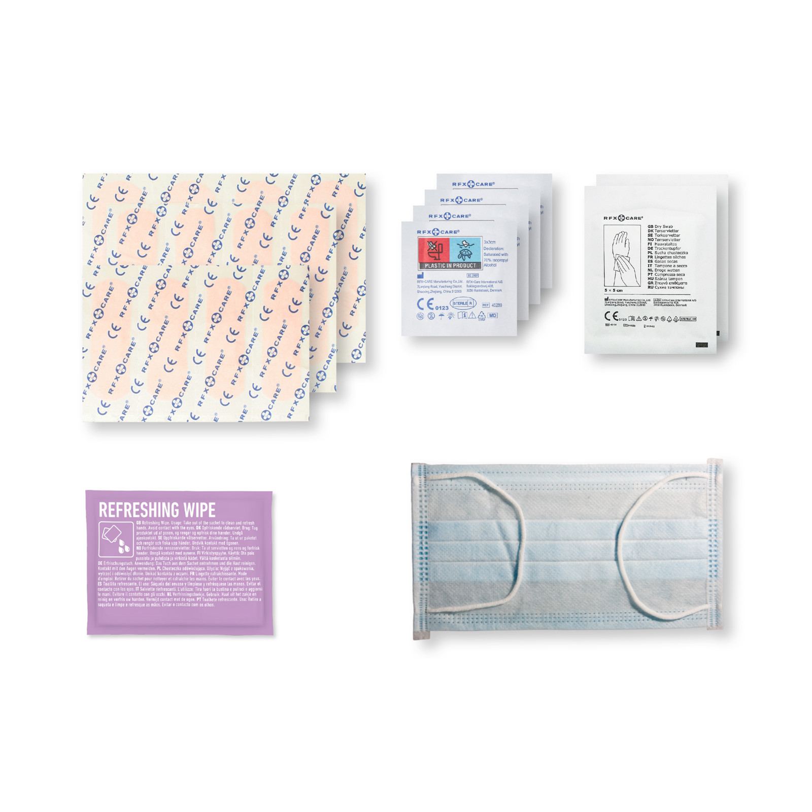 Este kit debería guardarse en todas las oficinas para poder afrontar pequeños accidentes o lesiones. Contenido: 12 apósitos resistentes al lavado, 2 bastoncillos secos, 1 mascarilla, 1 toallita refrescante y 4 bastoncillos para limpiar la piel. Todos los productos de primeros auxilios y cuidado del kit cumplen con las normativas vigentes en la UE. El precio incluye impresión a todo color. Se entrega en una funda de papel.