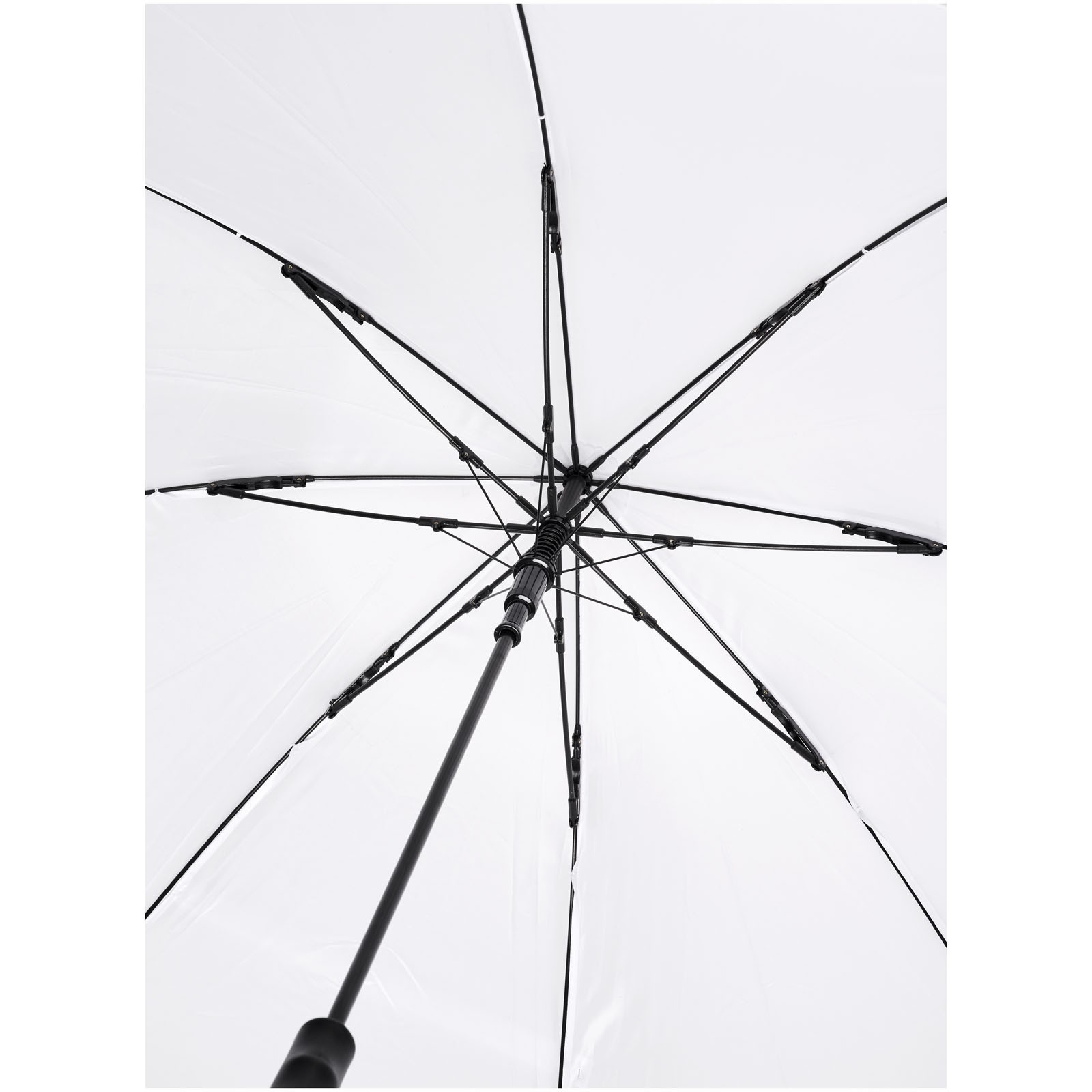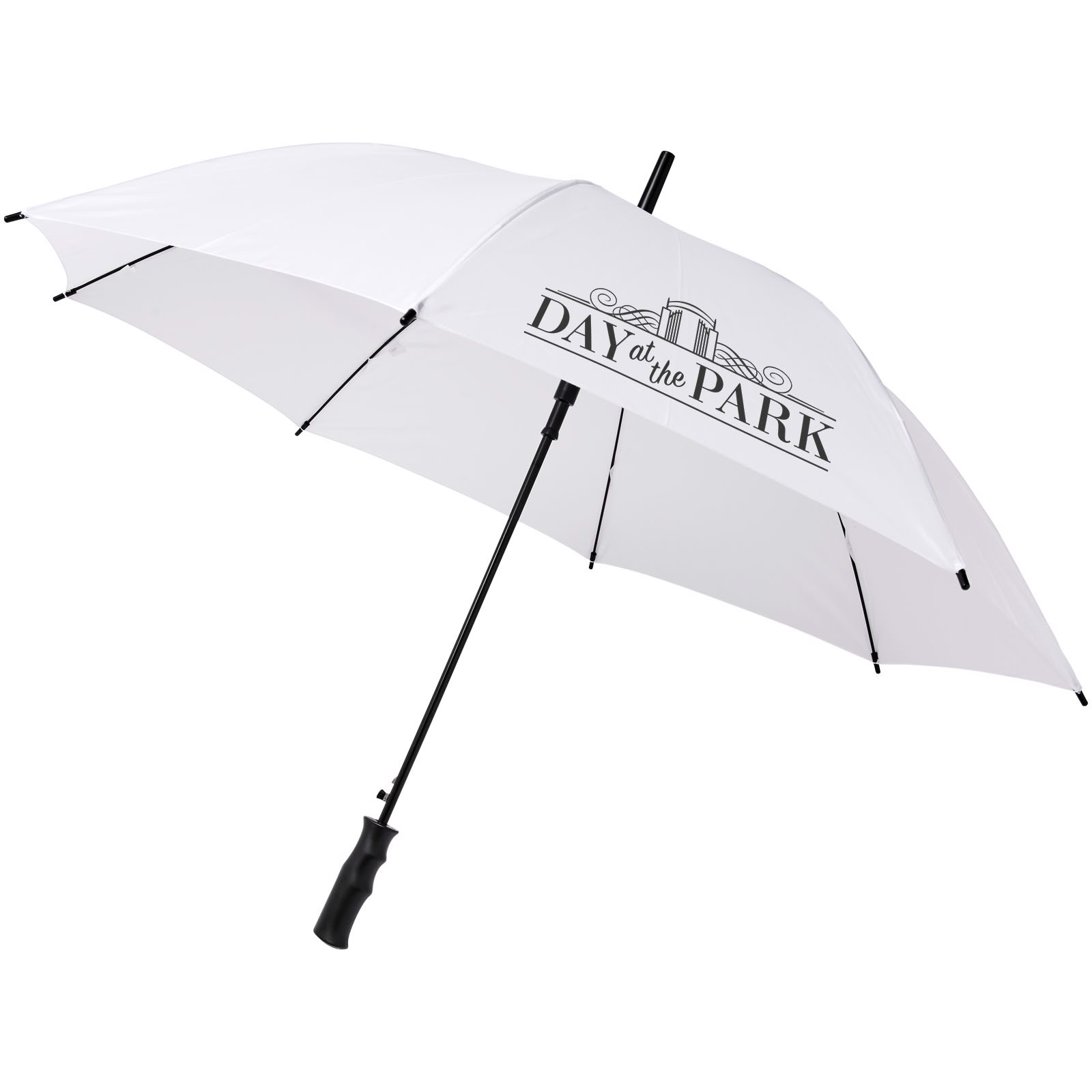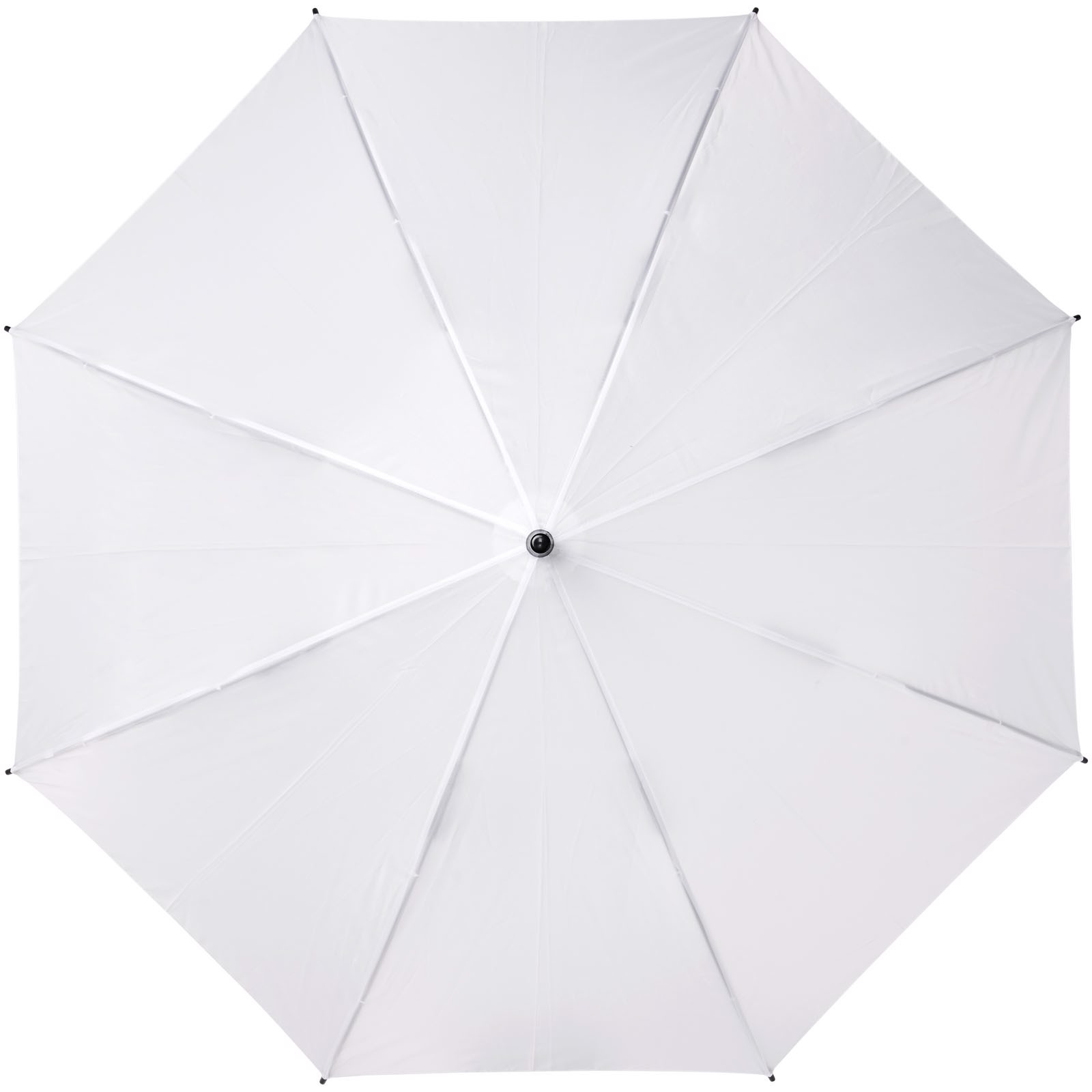 Paraguas de apertura automática con capa exterior de poliéster de tafetán. Tiene un robusto eje metálico y una estructura patentada de fibra de vidrio de alta calidad, que ofrece la máxima flexibilidad en condiciones de viento. Mango de plástico recto, puntas y capa externa en la superior. Disponible en una amplia variedad de colores contemporáneos y con una gran zona de decoración.