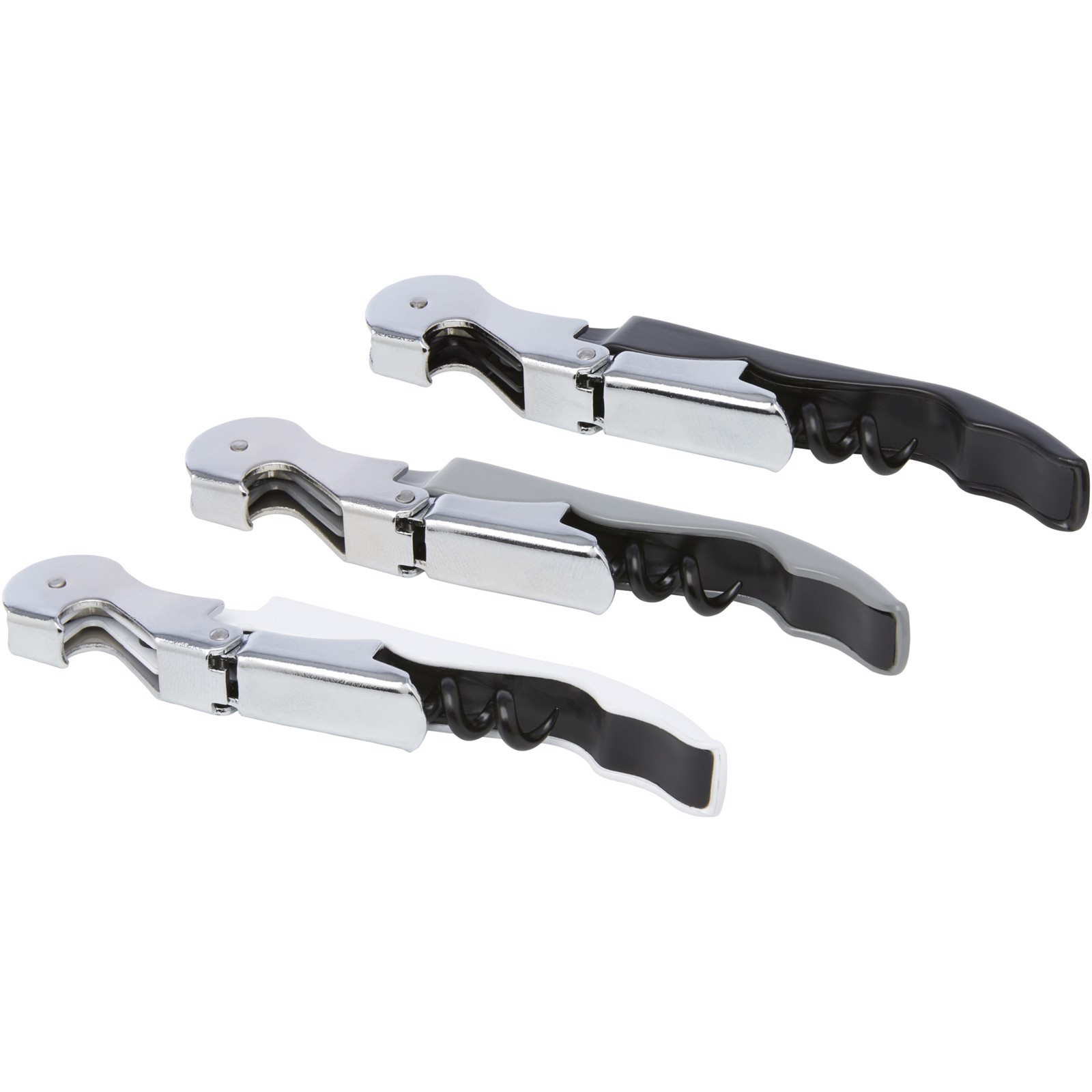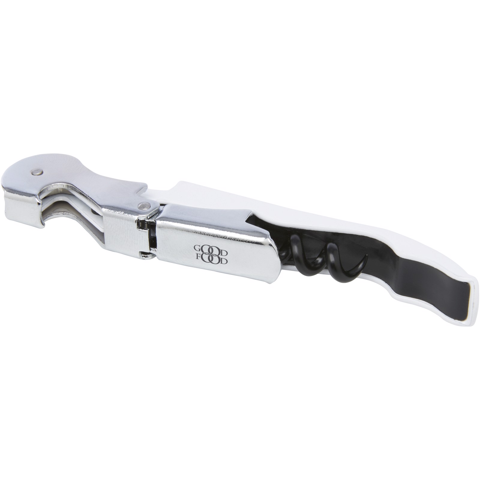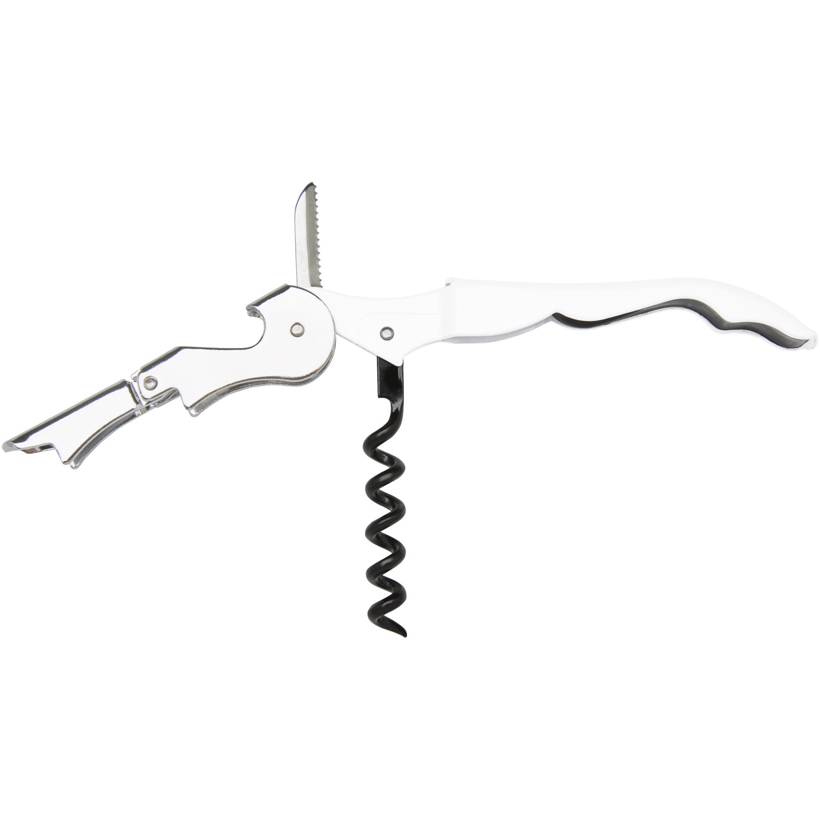 Un abridor de camarero de acero inoxidable con cuerpo colorido, sacacorchos, cortacápsulas y abrebotellas. Gracias a su estructura de dos tiempos es fácil sacar el corcho de la botella.