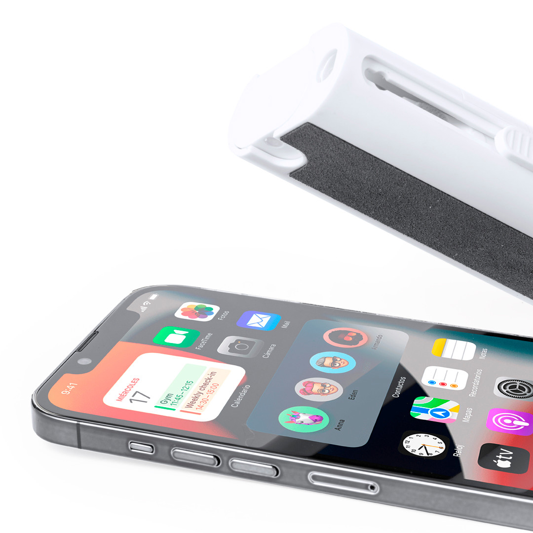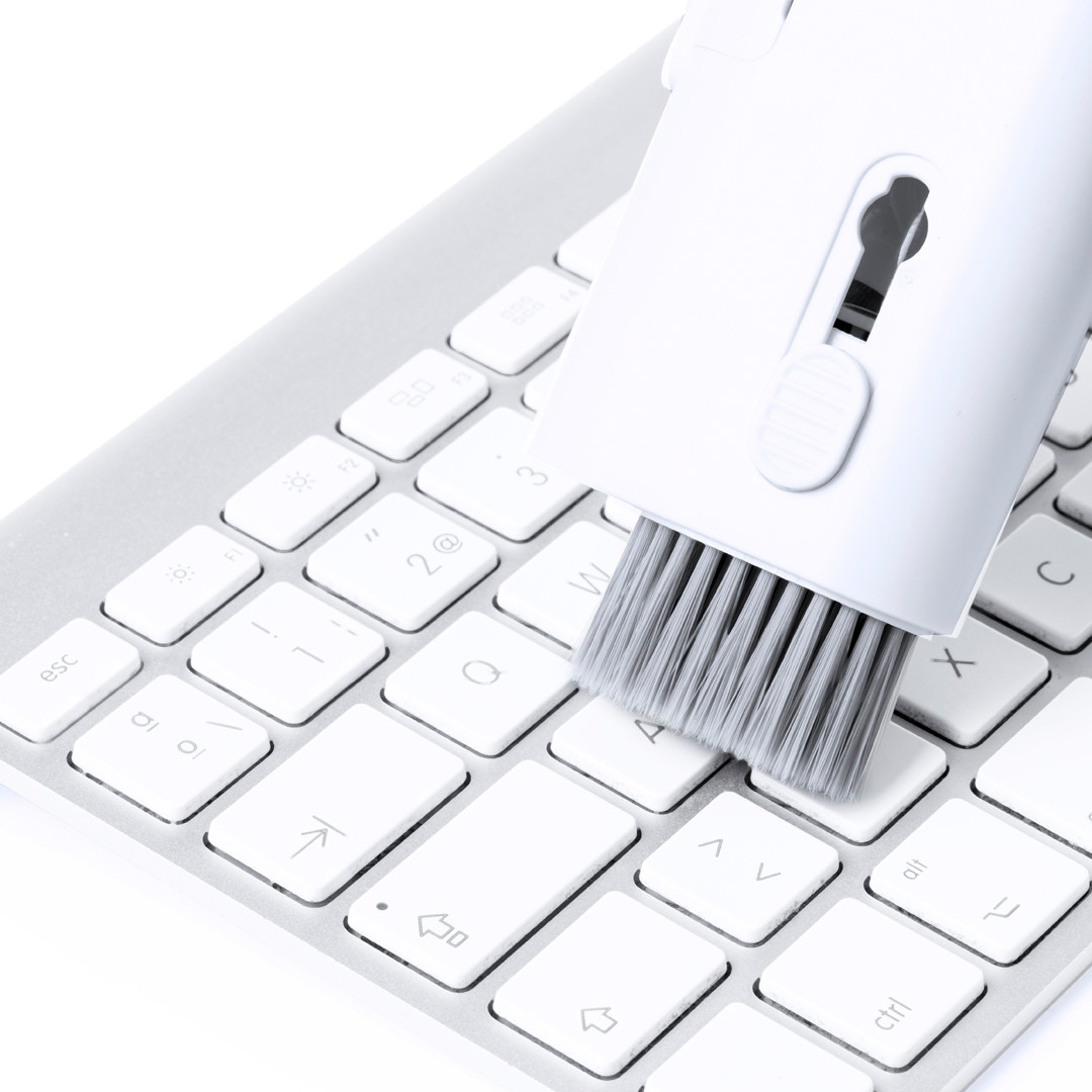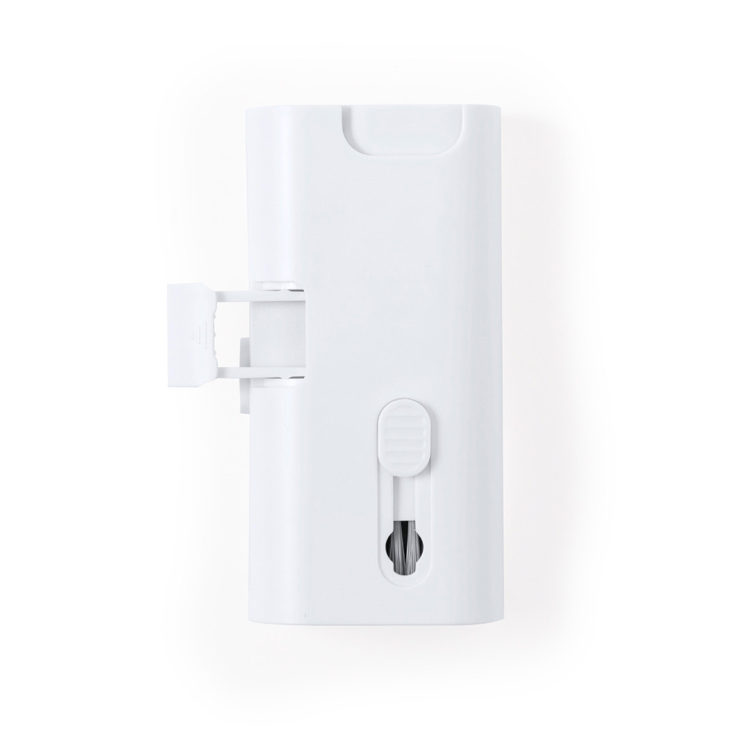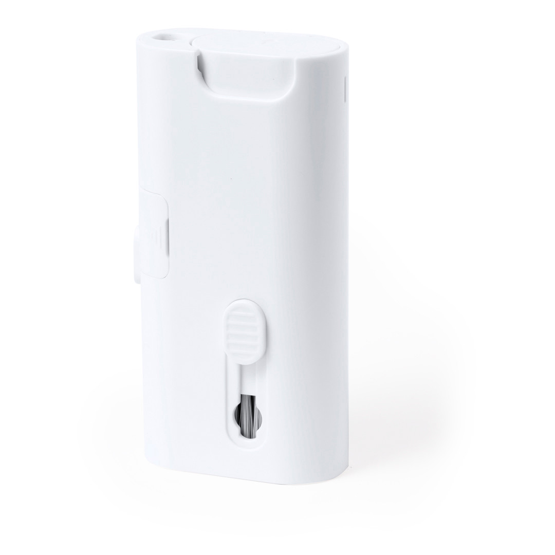 Completo set de limpieza de 6 funciones, especialmente diseñado para el cuidado y mantenimiento de los gadgets tecnológicos. Todos los accesorios se alojan en el interior de la carcasa y se están listos para usar deslizando el botón correspondiente a cada uno de ellos. Incluye depósito interior rellenable con pulverizador, zona limpia pantallas, punta metálica, bastón limpiador, cepillos de diferentes formas y accesorio para extraer teclas. Fabricado en resistente ABS, con elegante diseño en color blanco y presentado individualmente en caja de diseño kraft. 6 Funciones. Líquido No Incluido
