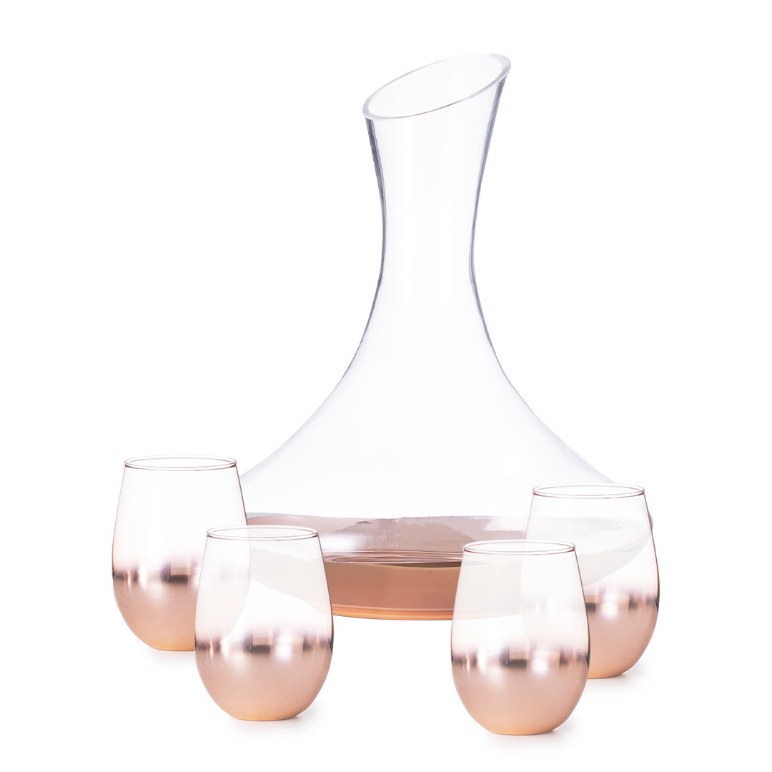 Elegante set de vinos fabricado en cristal, con delicado e innovador recubrimiento rosado degradado. Un regalo de diseño que incluye 4 vasos de 500 ml y un decantador de 1,8 l.Presentado en exclusiva caja individual de diseño negra. 4 Vasos 500 ml. Decantador 1,8 L