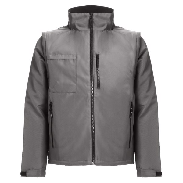 Chaqueta acolchada unisex (exterior: 170 g/m² 100 % poliéster oxford con revestimiento acrílico, relleno: 75 g/m² 100 % poliéster, interior: 65 g/m² 100 % poliéster tafetán). Convertible en chaleco, con mangas desmontables con cremallera. Contiene un cuello forrado con malla polar y tres bolsillos con cremallera. Acceso con cremallera en la parte posterior para una fácil personalización. Tallas: S, M, L, XL, XXL, 3XL
