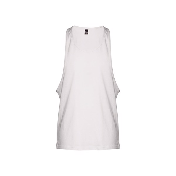 Camiseta sin mangas unisex en punto jersey de algodón 100% (140 g/m²) con hilo de algodón cardado. Tiene tirantes anchos y cuello redondo, rematados con ribete. Pieza cortada y cosida con doble costura en la parte inferior. Tallas: XS, S, M, L, XL, XXL