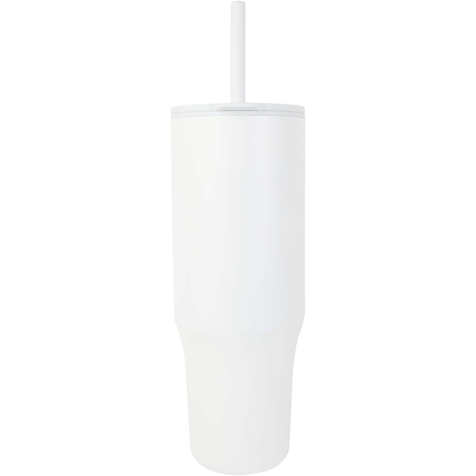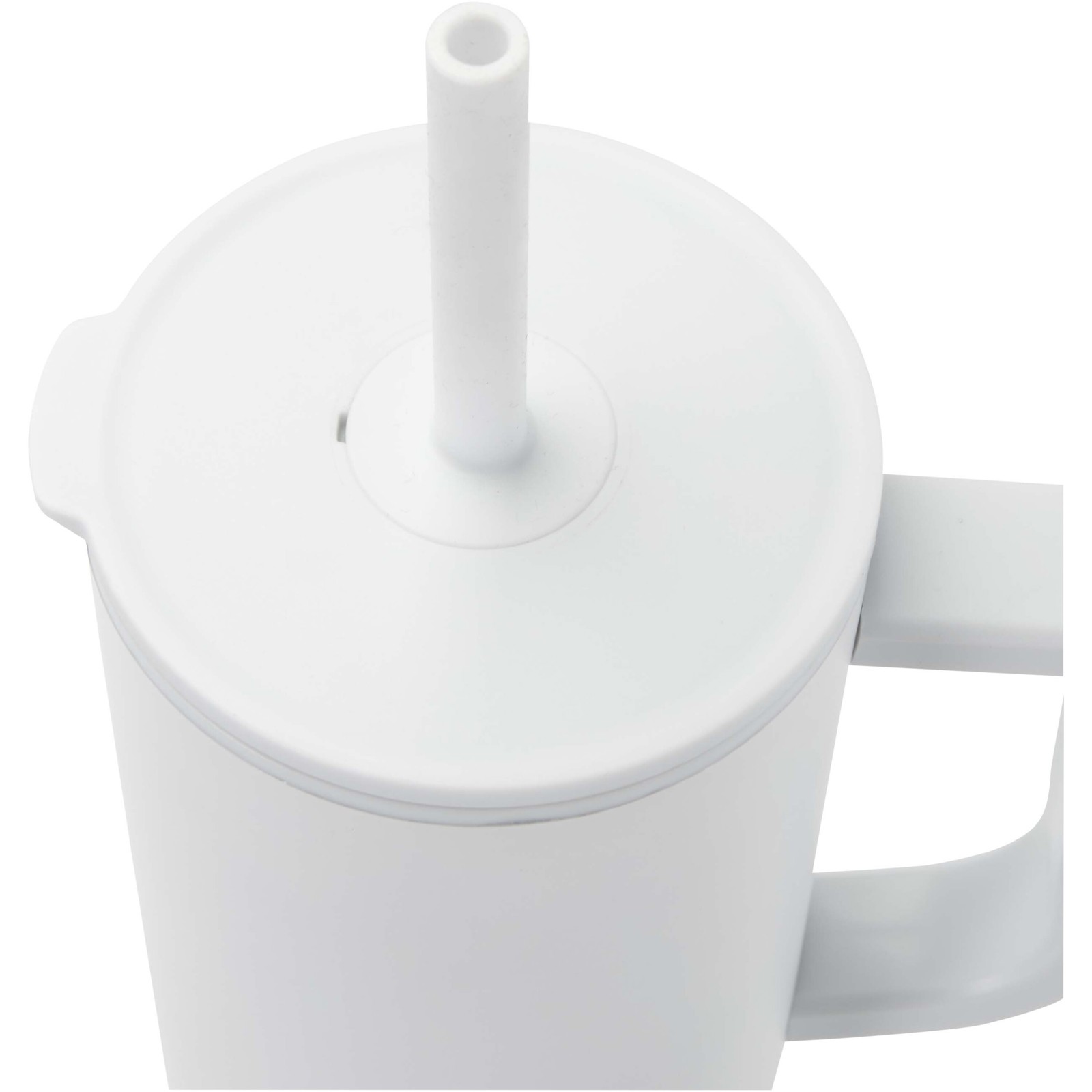 Vaso con pared exterior duradera de acero inoxidable reciclado con certificado RCS y pared interior de plástico. Mantiene las bebidas frias durante 48 horas y las calientes durante 12 horas. Incluye una pajita de silicona alimentaria integrada y una tapa a presión a prueba de salpicaduras para beber sin problemas. Este vaso también es adecuado para bebidas calientes, pero no se aconseja tomarlas con la pajita. Capacidad: 900 ml. Lavado a mano únicamente.