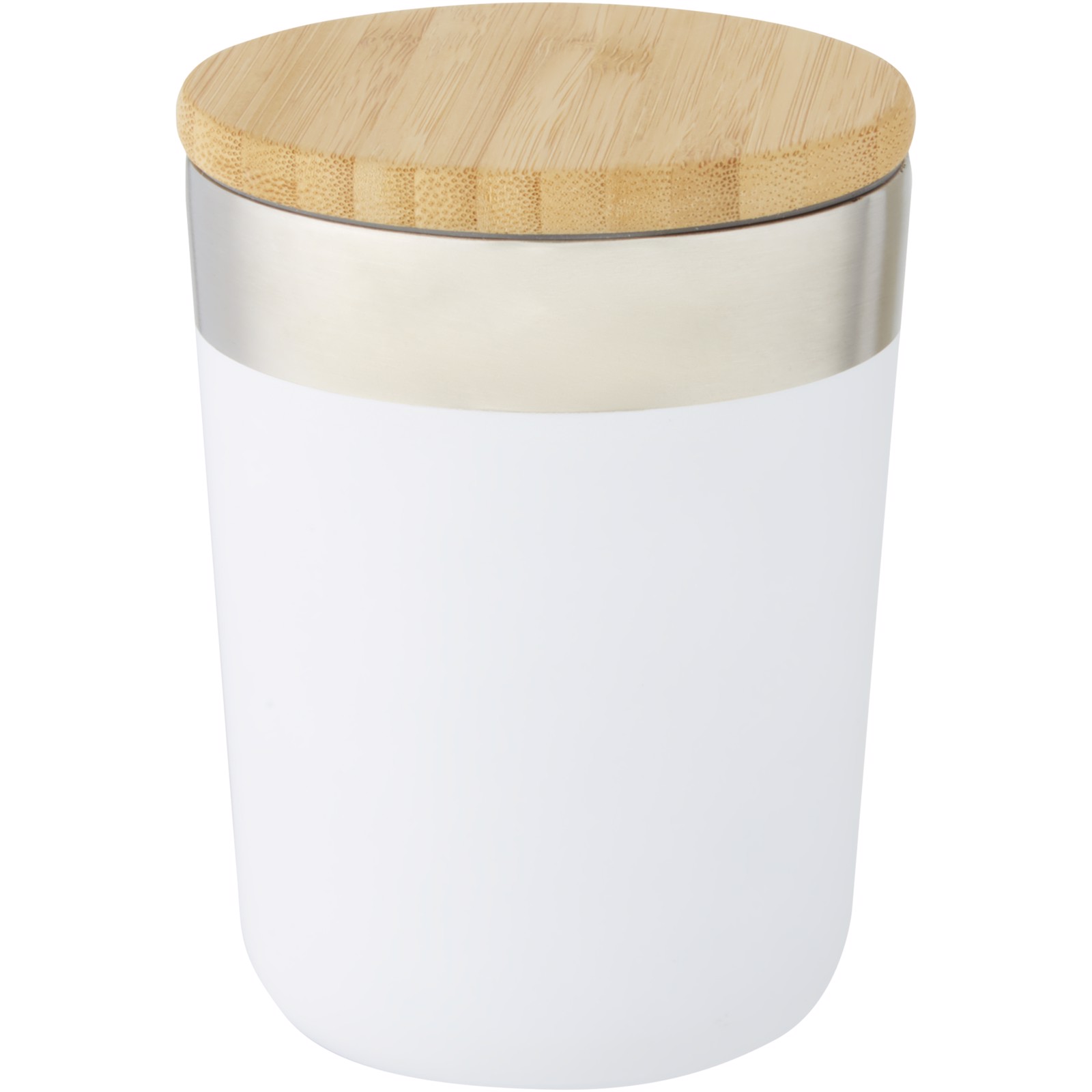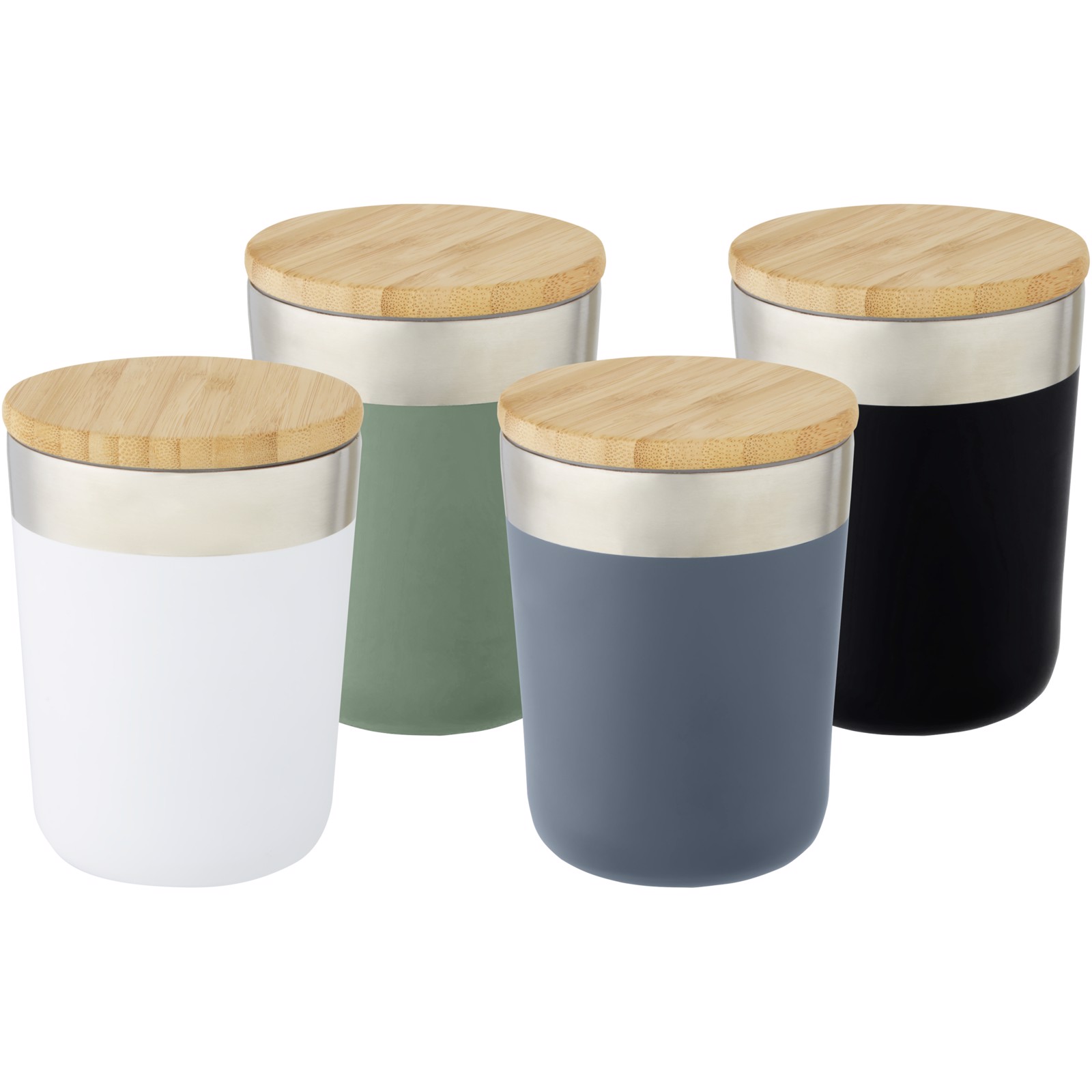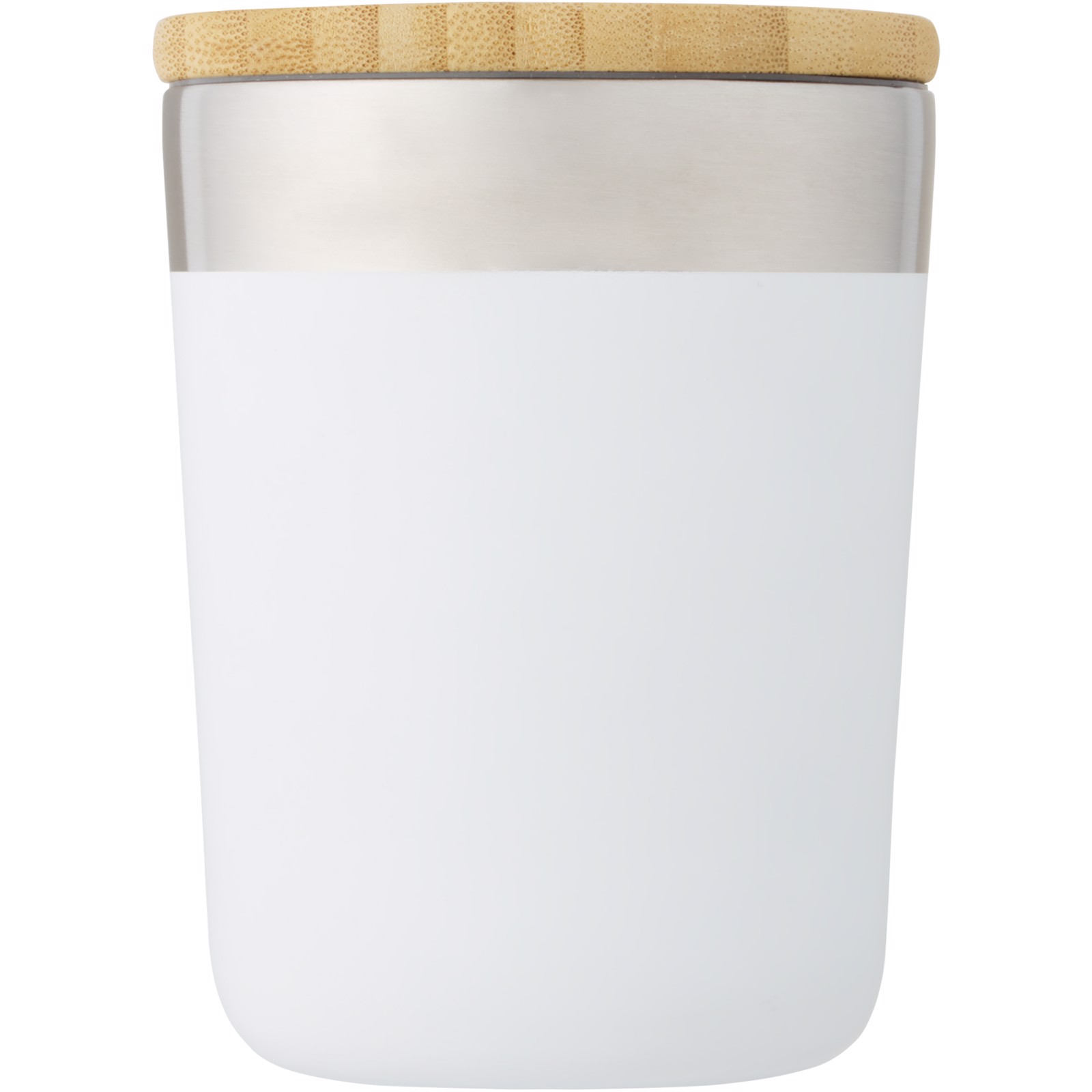 Vaso con aislamiento al vacío de cobre de doble pared, con un diseño moderno y una tapa de bambú orgánico. El acero inoxidable 18/8 con aislamiento mantiene las bebidas calientes o frías durante varias horas. No contiene BPA y se ha probado y homologado según la legislación alemana sobre seguridad alimentaria (LFGB), y se ha comprobado el contenido de ftalatos según la normativa REACH. Cabe debajo de la mayoría de las cafeteras, por lo que es el vaso perfecto para usar en los desplazamientos. Capacidad de 330 ml. Se presenta en una caja de regalo de cartón reciclado. Se recomienda lavarla a mano.