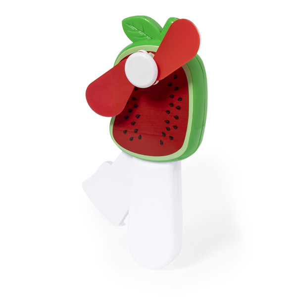 Ventilador en divertidas formas de fruta, fabricado en resistente ABS. Funcionamiento manual, apretando apretando continuamente en la palanca integrada en el mango para poder mover las aspas. Disponible en diseños fresa, piña, uva, sandía o naranja. Presentado individualmente en bolsa reciclada. Manual