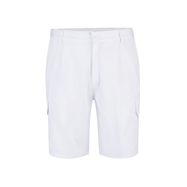 Bermudas de sarga multibolsillos (200 g/m²), algodón (35%) y poliéster (65%). Con cinturilla elástica y seis bolsillos (2 bolsillos franceses, 2 bolsillos laterales y 2 bolsillos traseros de fuelle). Tamaño: 36, 38, 40, 42, 44, 46, 48, 50, 52, 54, 56, 58, 60