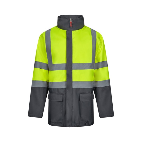 Two-tone 4-in-1 parka (180g/m²), in polyester (100%) with PU coating. Four pieces in one: parka, raincoat, jacket and vest.Parka/raincoat: with hidden central zip with placket, which closes with hook-and-loop, reflective stripes on the torso, shoulders and sleeves and hidden hood, with two lower pockets.Jacket/vest: with central zip, reflective stripes on the torso and shoulders, ribbed cuffs and detachable sleeves. With three pockets (2 lower pockets and 1 inner pocket). Producto conforme al Reglamento UE 2016/425, certificado por EN20471 y clase Nº 2. Tamaño: S, M, L, XL, 2XL, 3XL